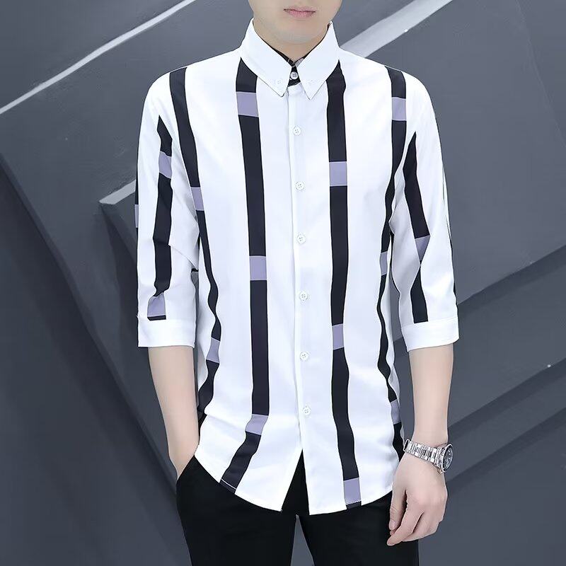 夏季条纹短袖衬衫男潮牌新款男装七分袖上衣服高级感痞帅休闲衬衣