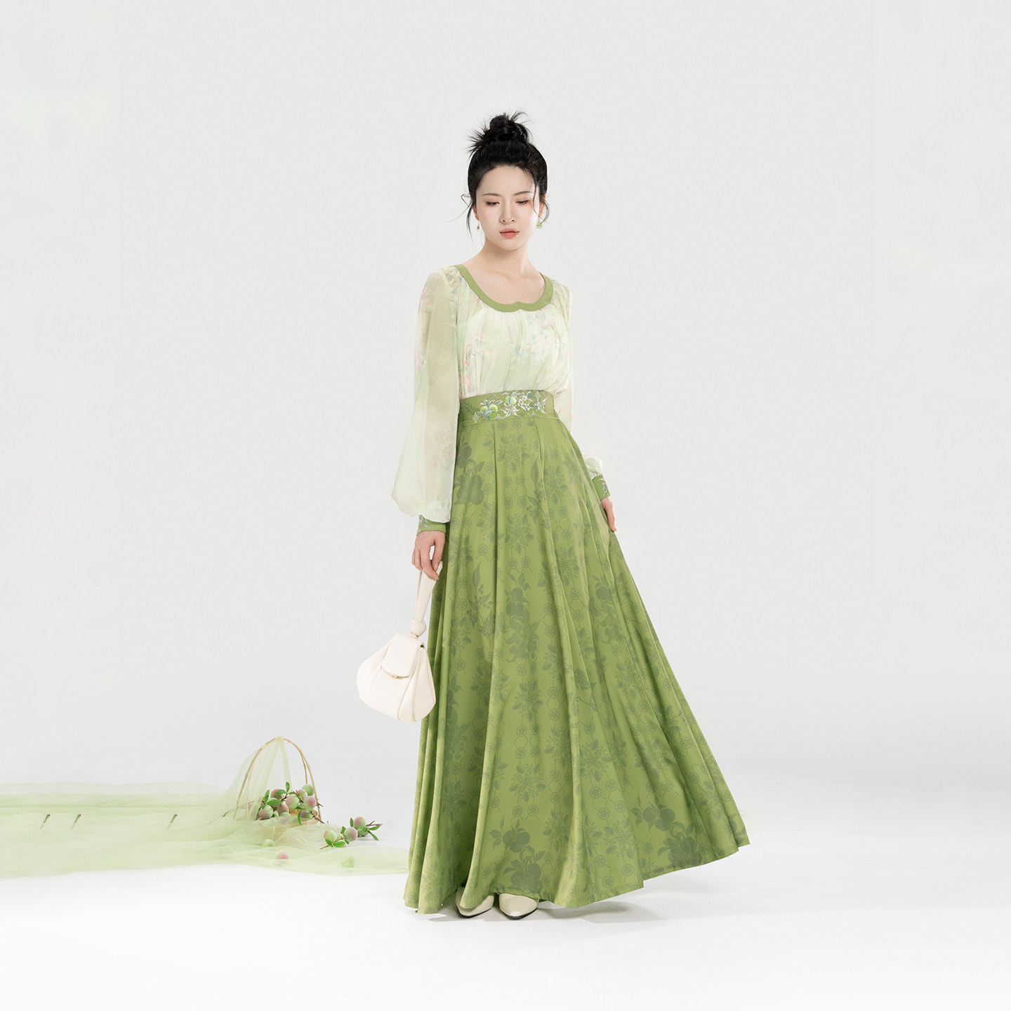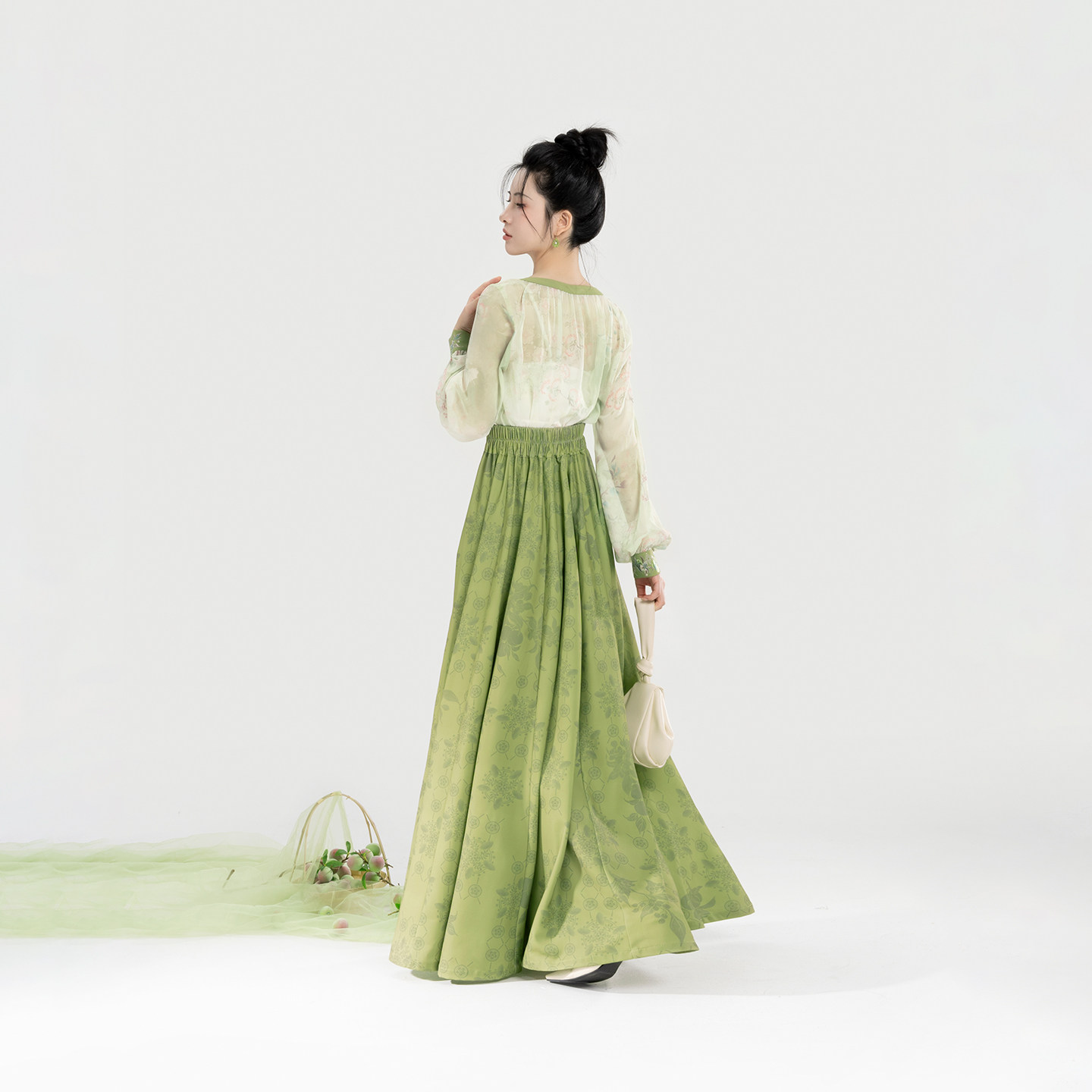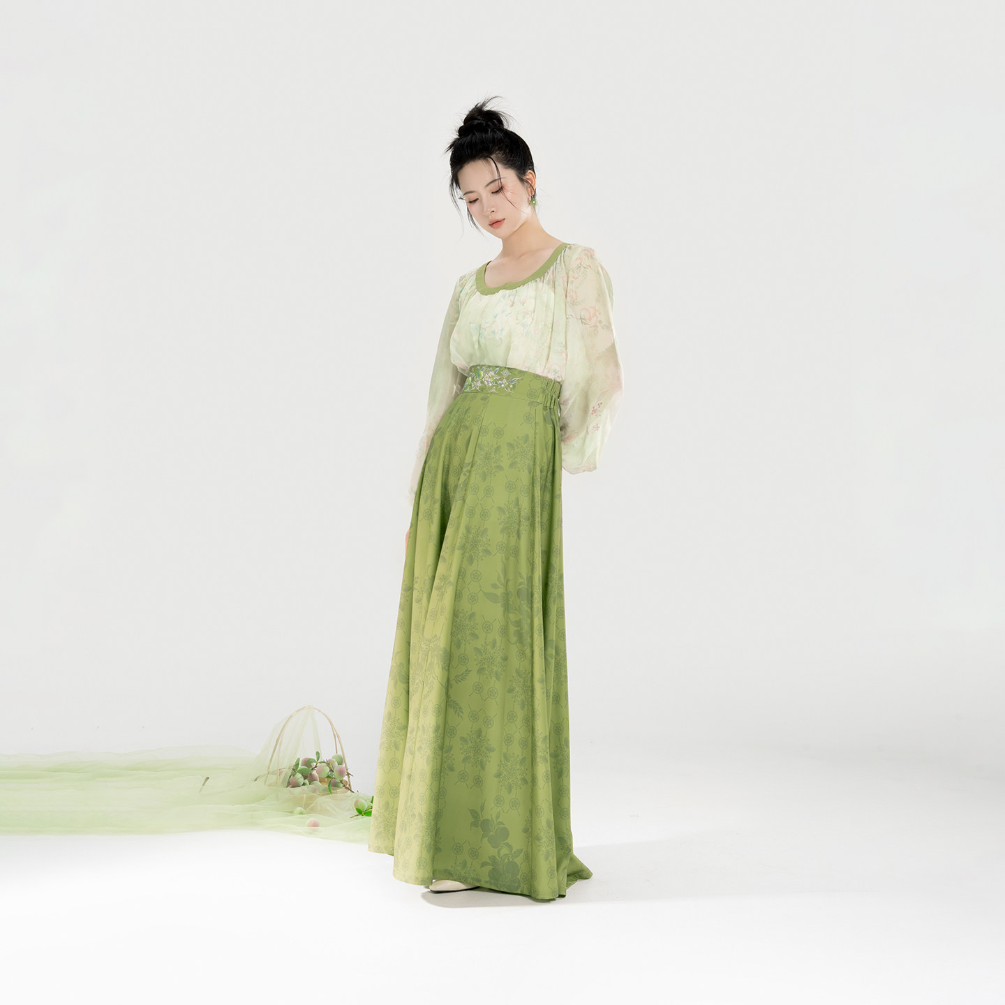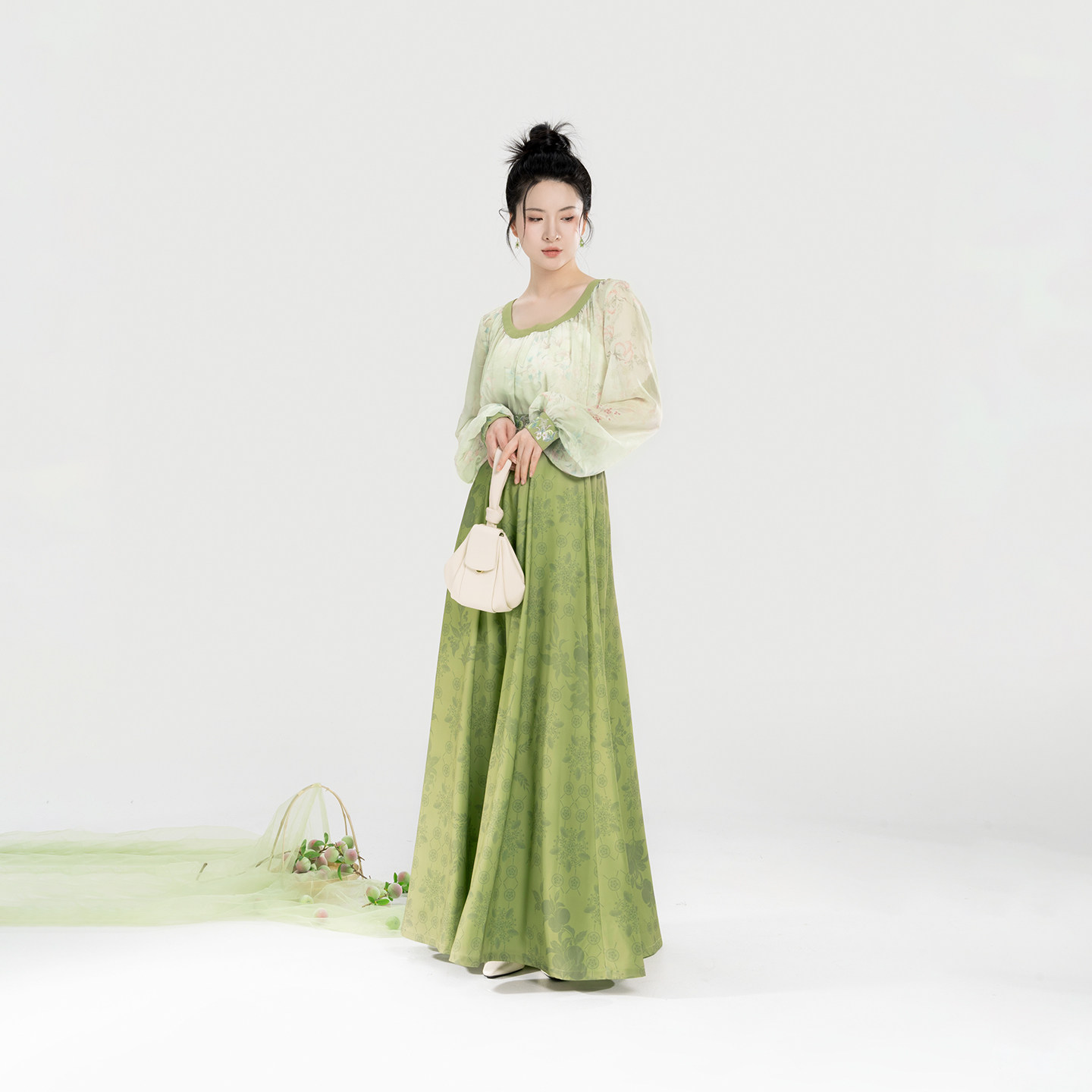 织造司[青梅弄]原创新中式鸡心领雪纺束口灯笼袖衬衫半身八破裙女