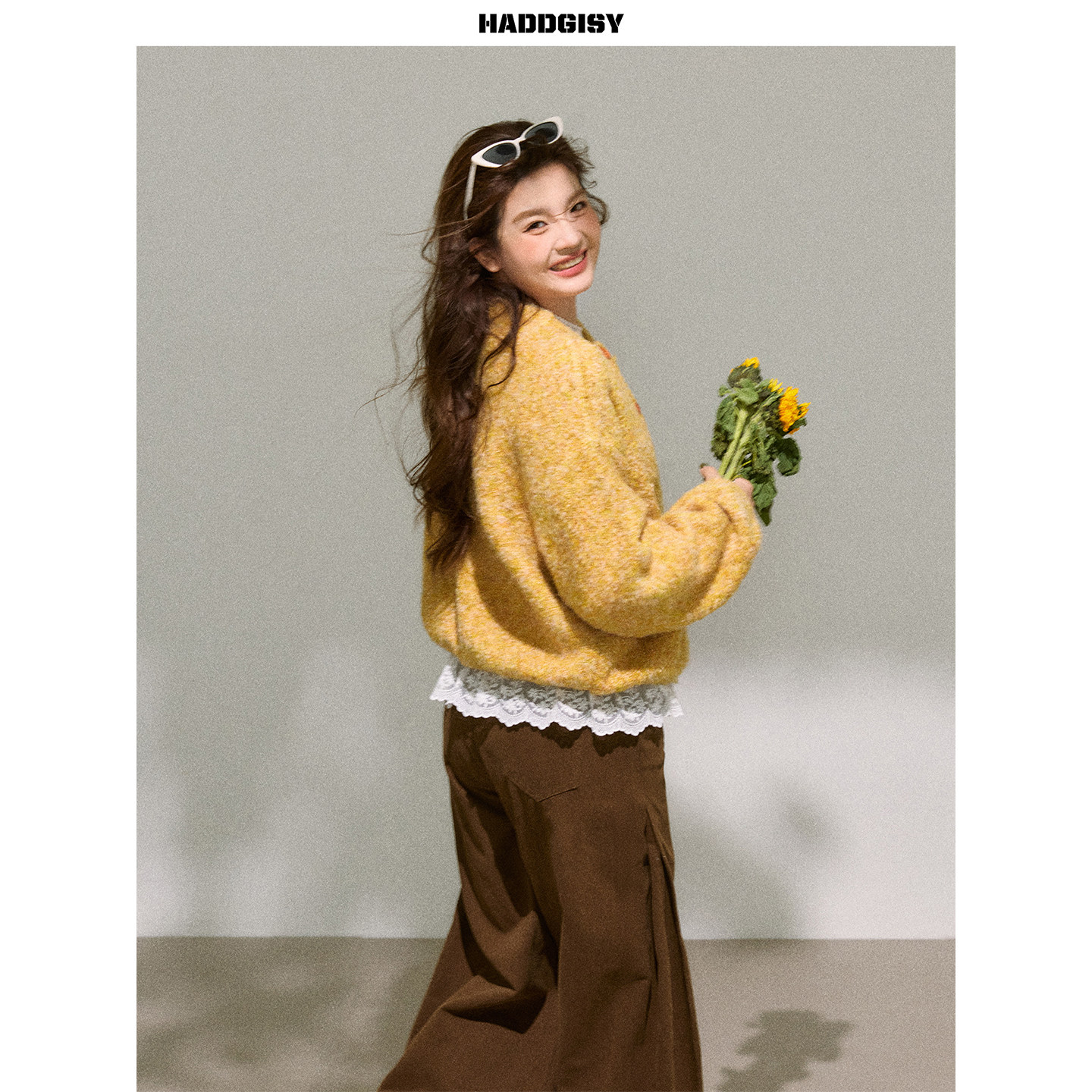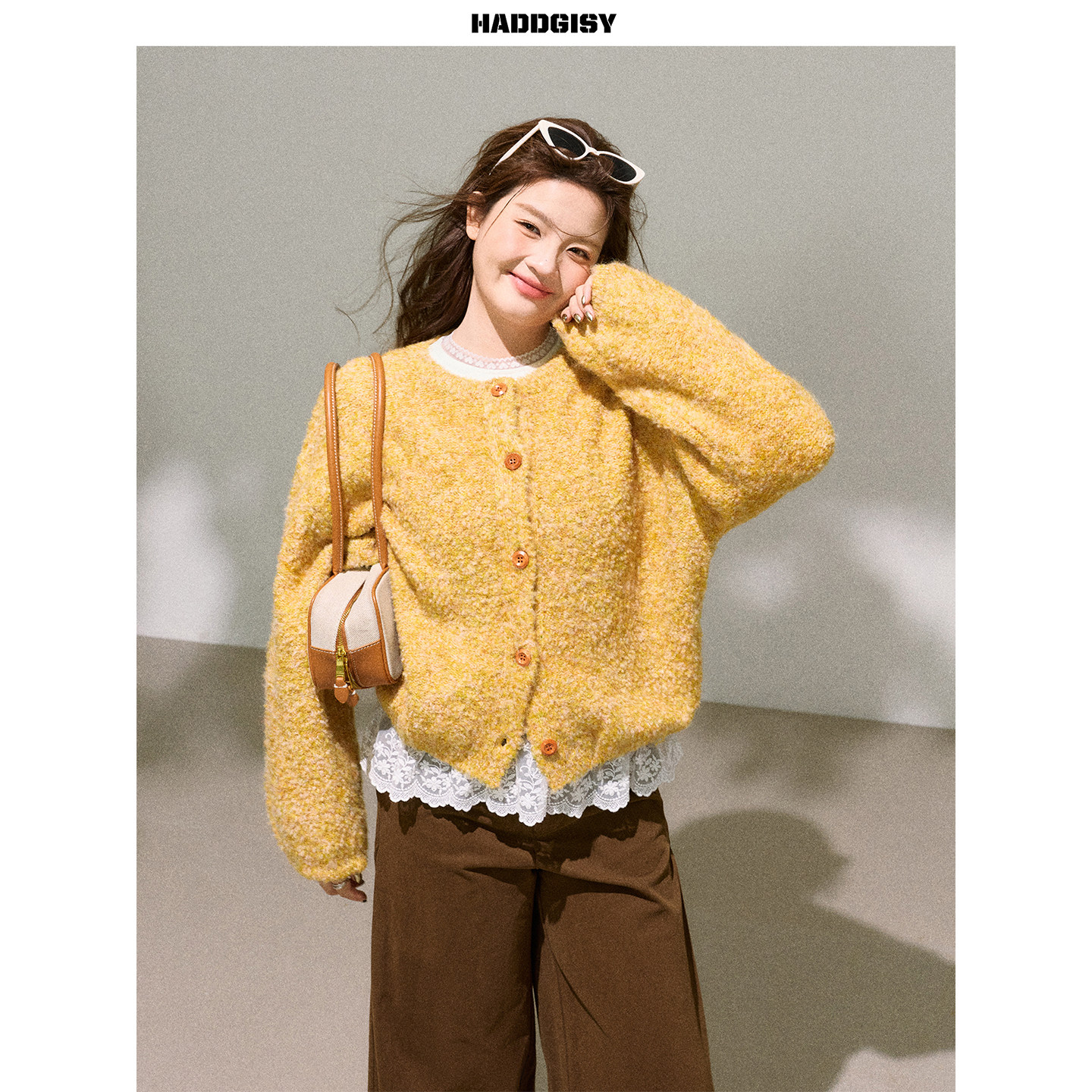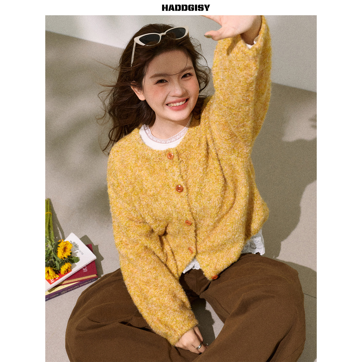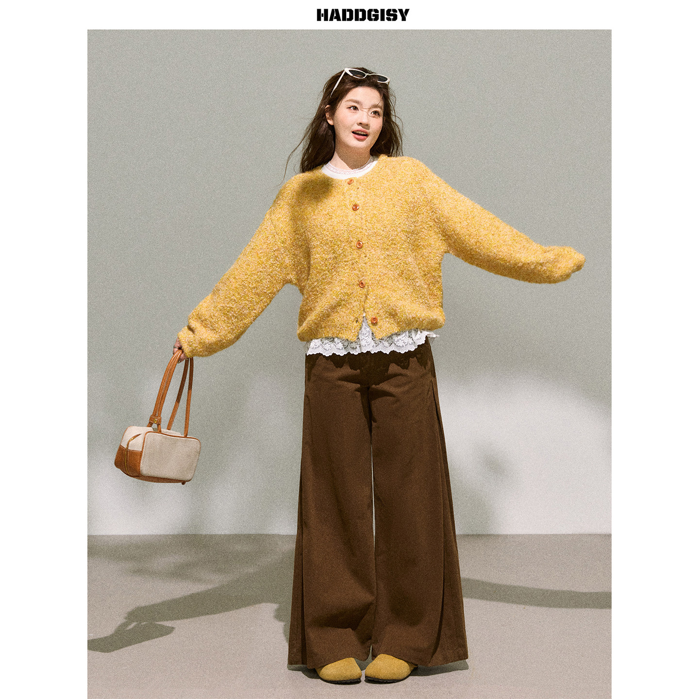 曾小咸大码女装 适合胖mm黄色毛衣开衫显瘦阔腿休闲裤套装2025冬