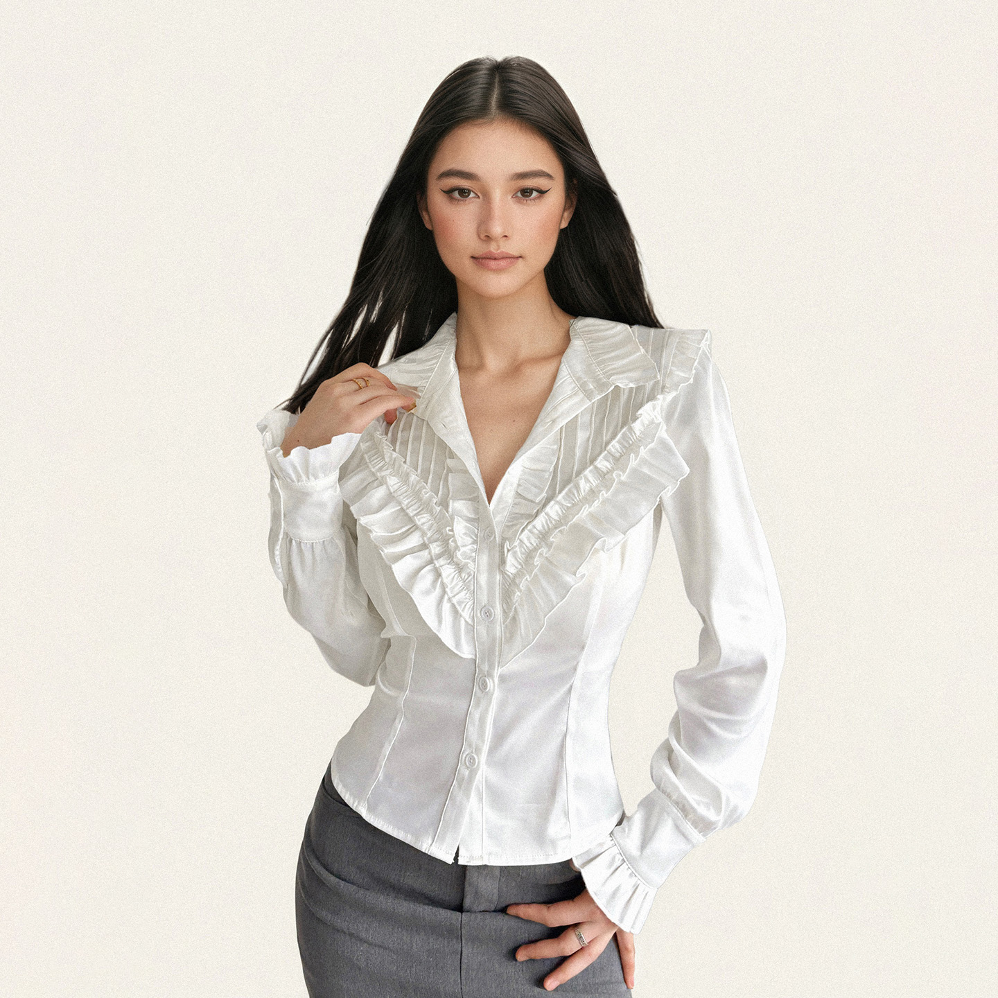 FUNOFF 法式宫廷风白色荷叶边长袖衬衫复古纽扣收腰立领收腰上衣