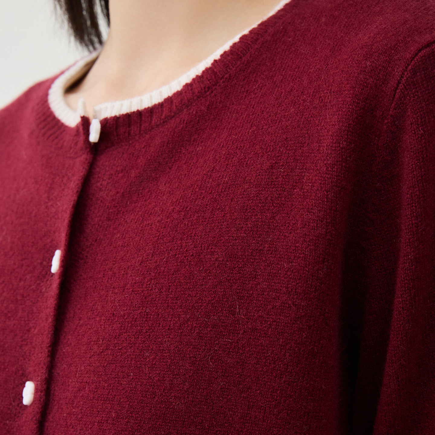春竹100%羊绒2025秋冬新款百搭显瘦圆领撞色长袖女士针织开衫上衣