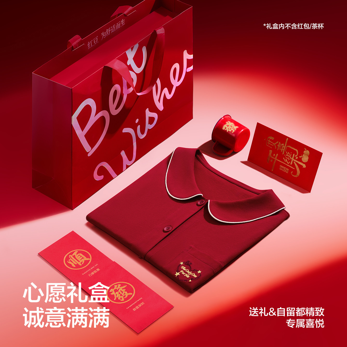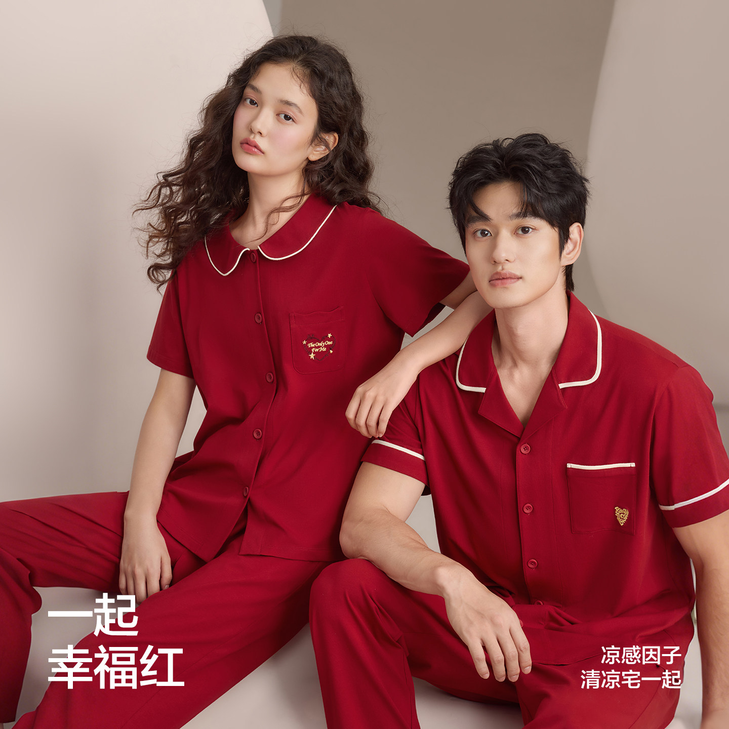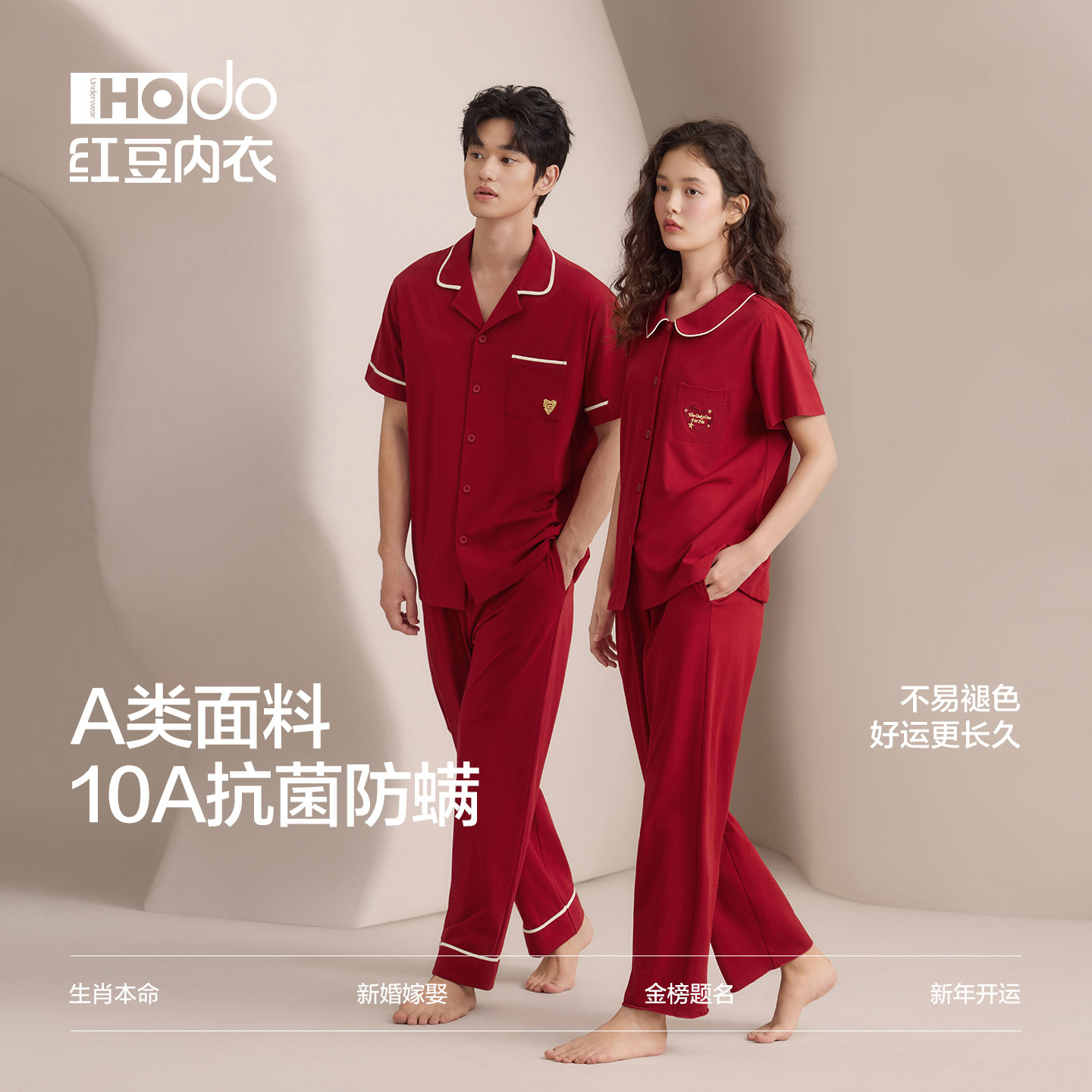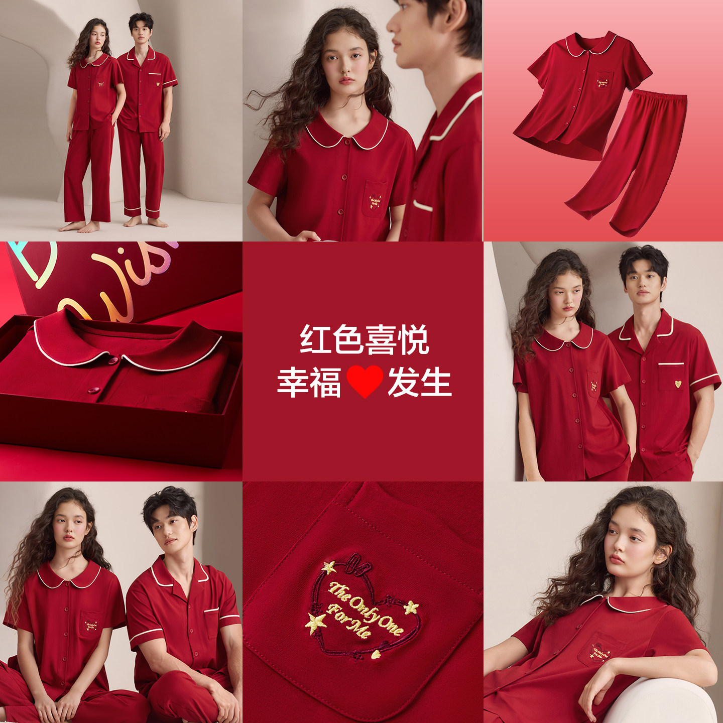 红豆情侣红色睡衣短袖长裤女本命年结婚新婚凉感棉男士家居服套装