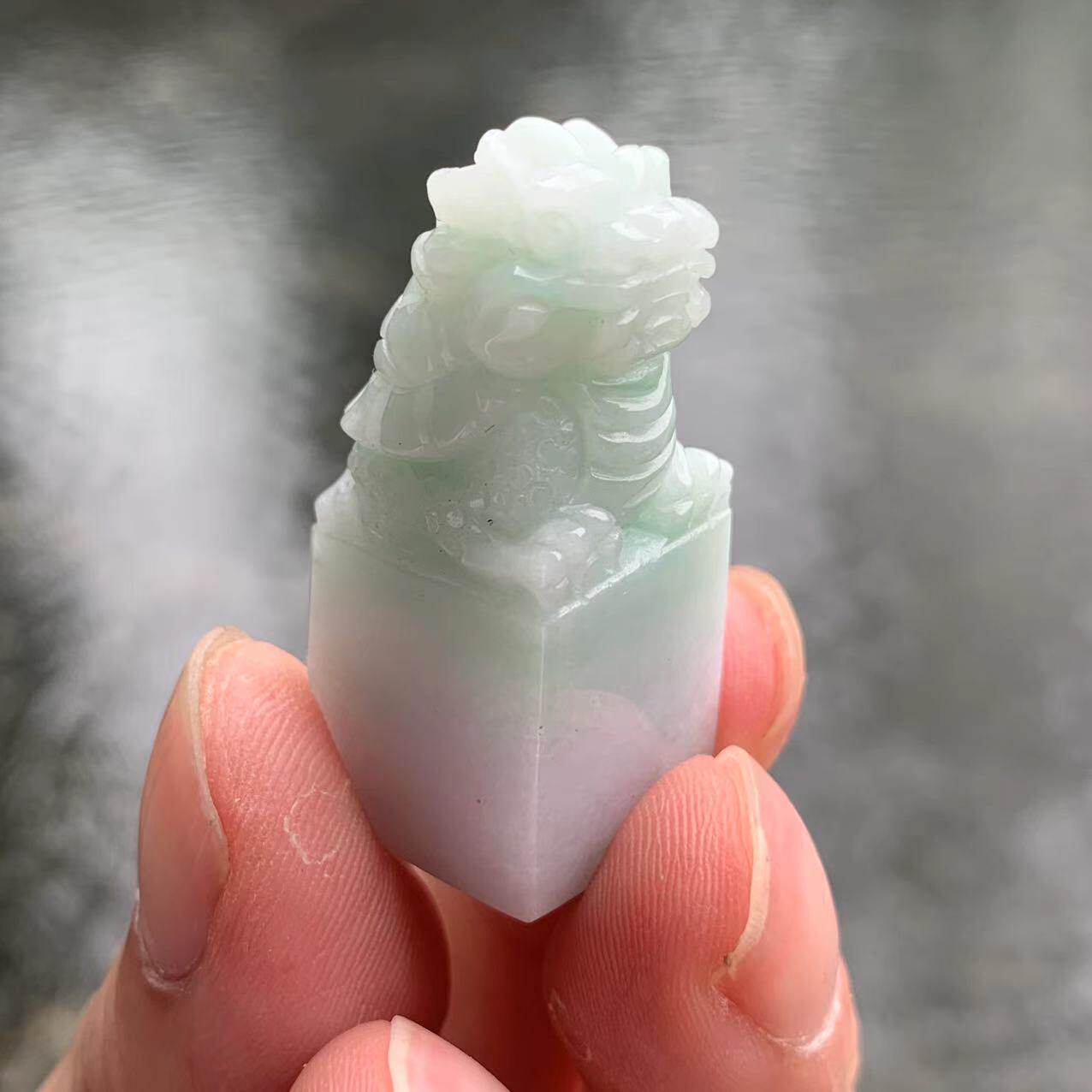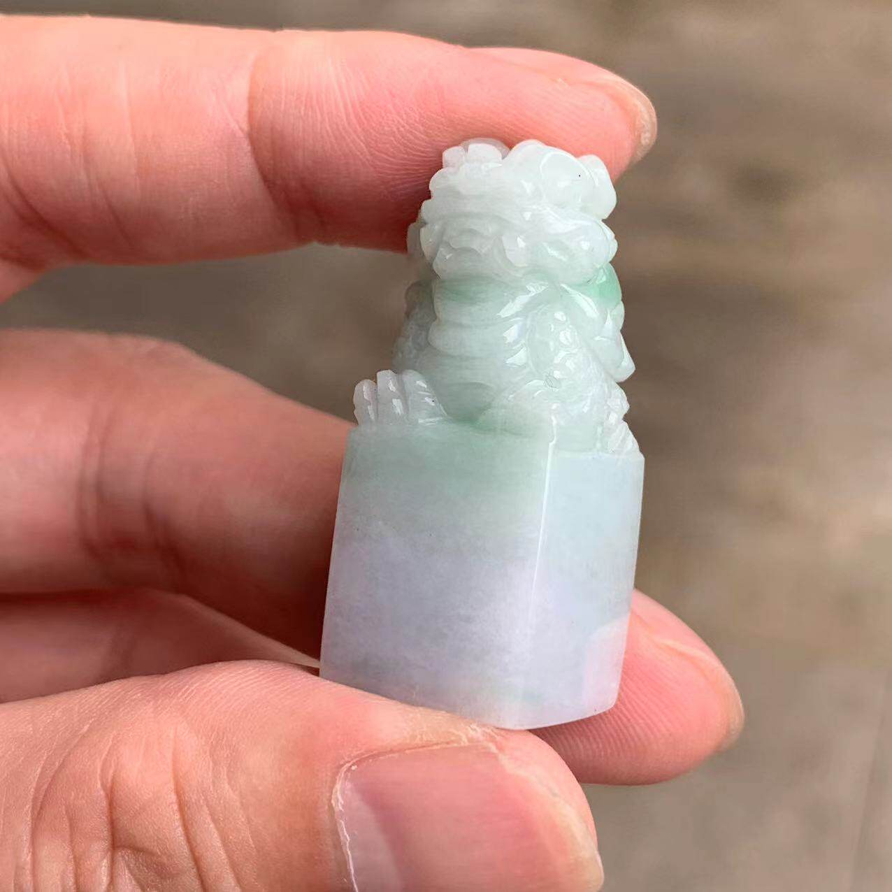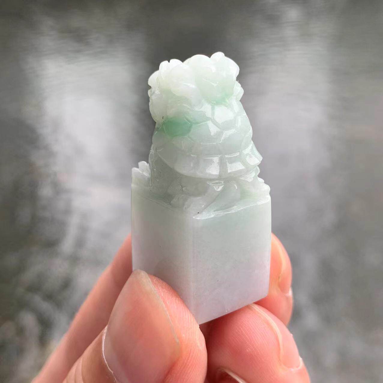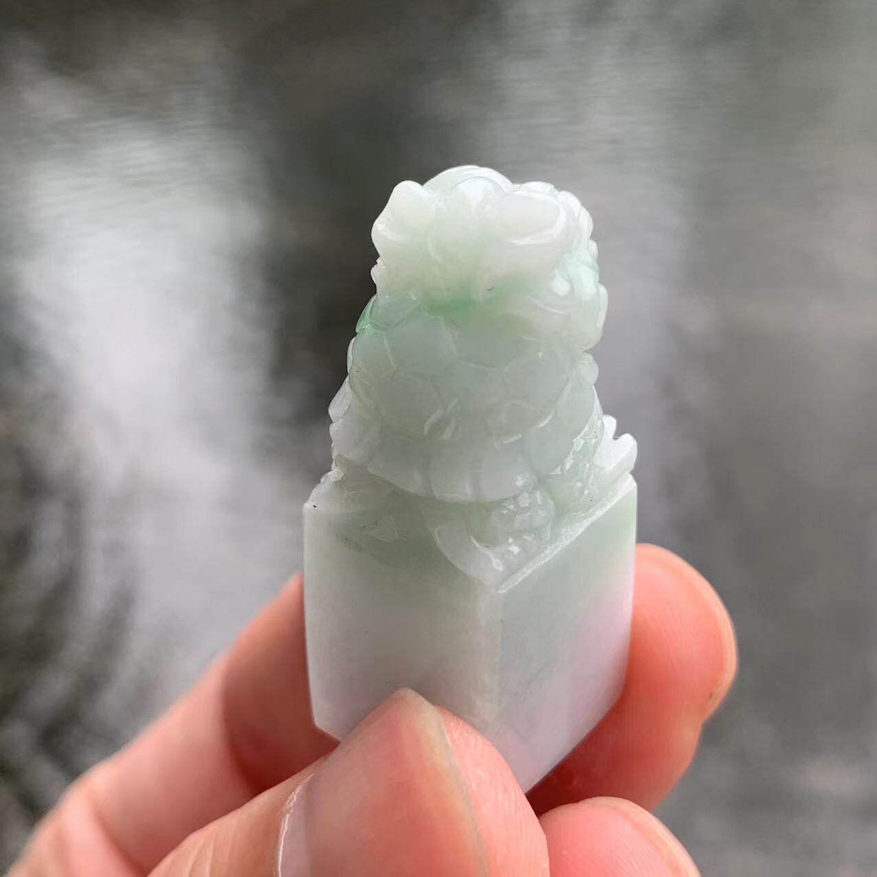 缅甸天然A货翡翠印章双彩淡紫底飘阳绿龙龟玄武印章摆件一物一证