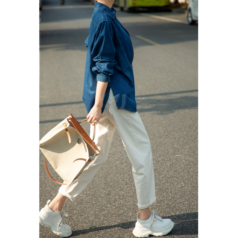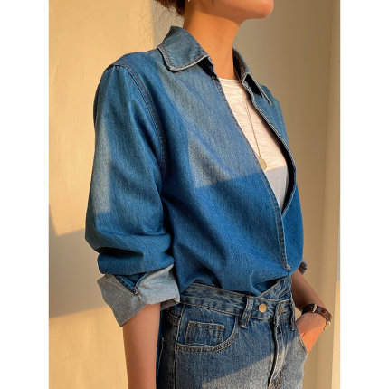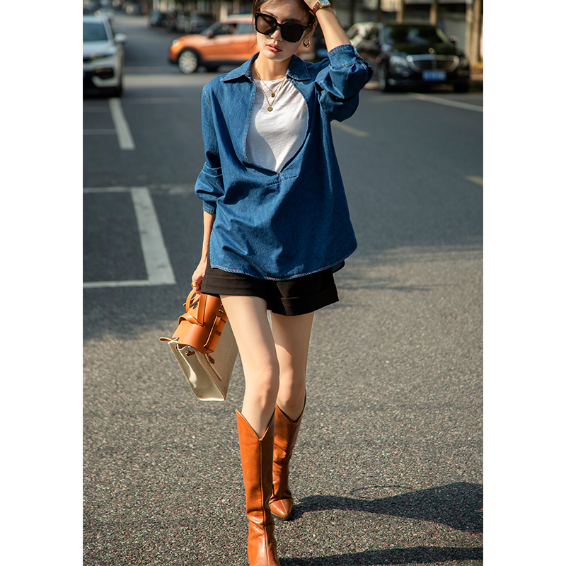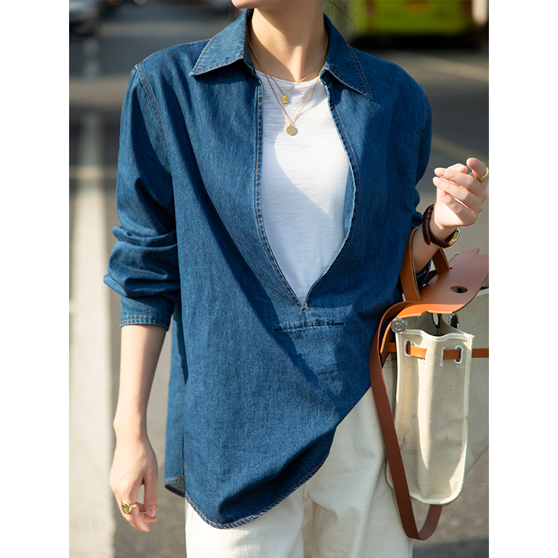 叠穿牛仔衬衫女2025年春秋新款长袖V领衬衣内搭设计感小众上衣