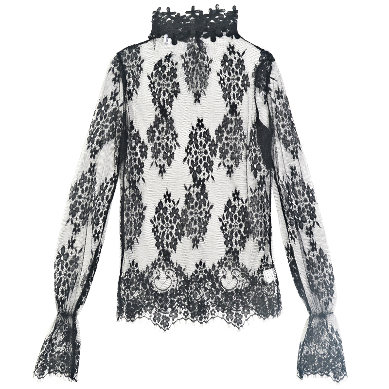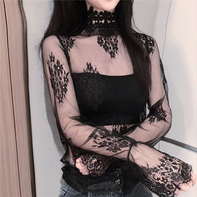 秋冬性感透明高领镂空蕾丝打底衫女网纱上衣大码喇叭长袖内搭纱衣
