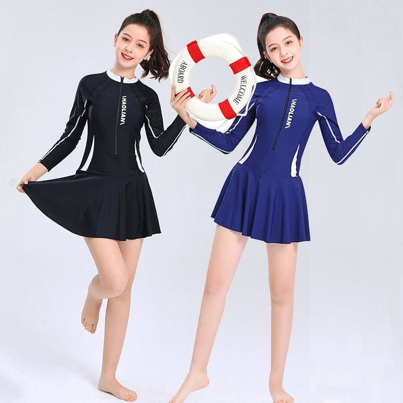 少女孩儿童连体裙式平角裤长袖中大童初高中学生防晒速干游泳衣装
