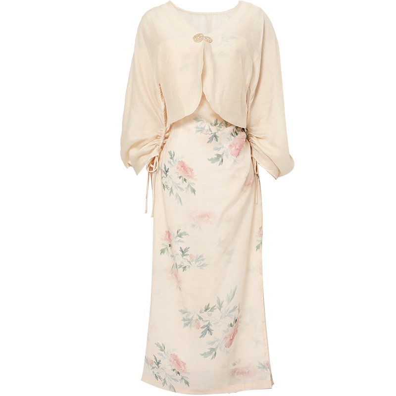 夏季女装2025新款时尚气质杏色开衫上衣印花连衣裙包臀裙裙子套装