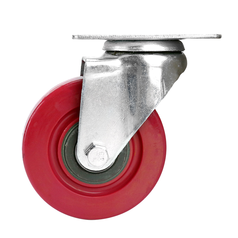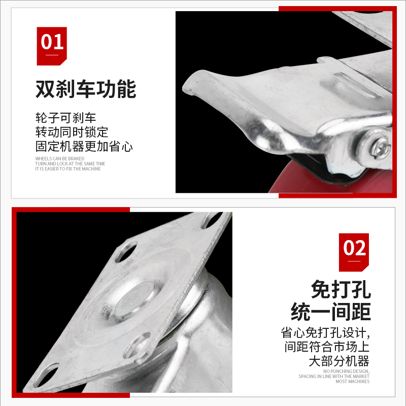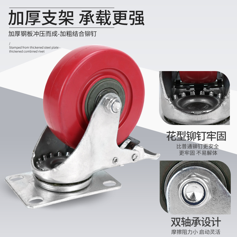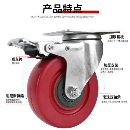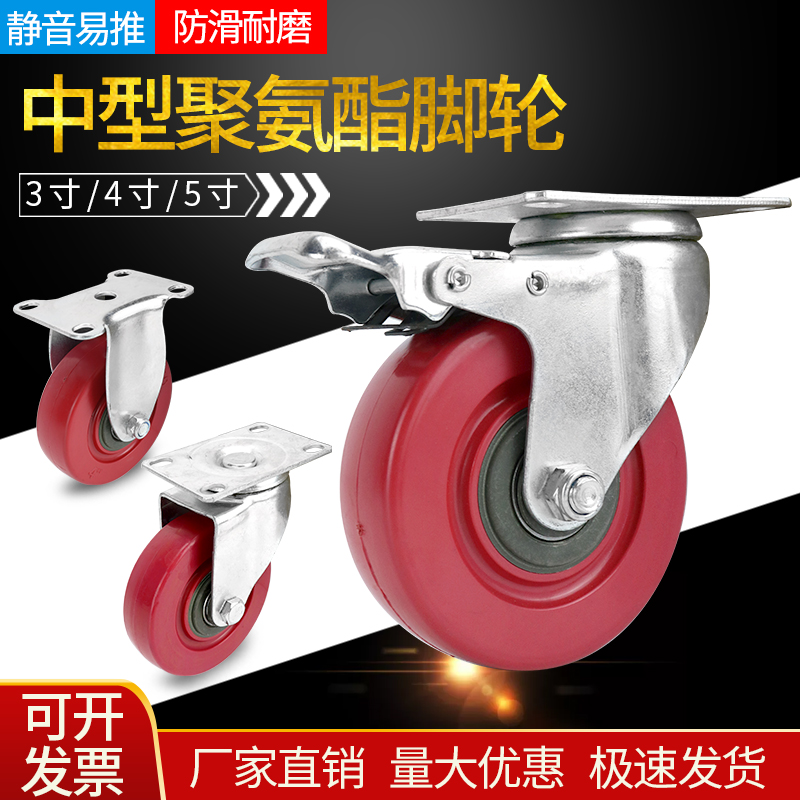 中型红色全包聚氨酯脚轮平板车定向轮子手推车轱辘刹车万向轮大全