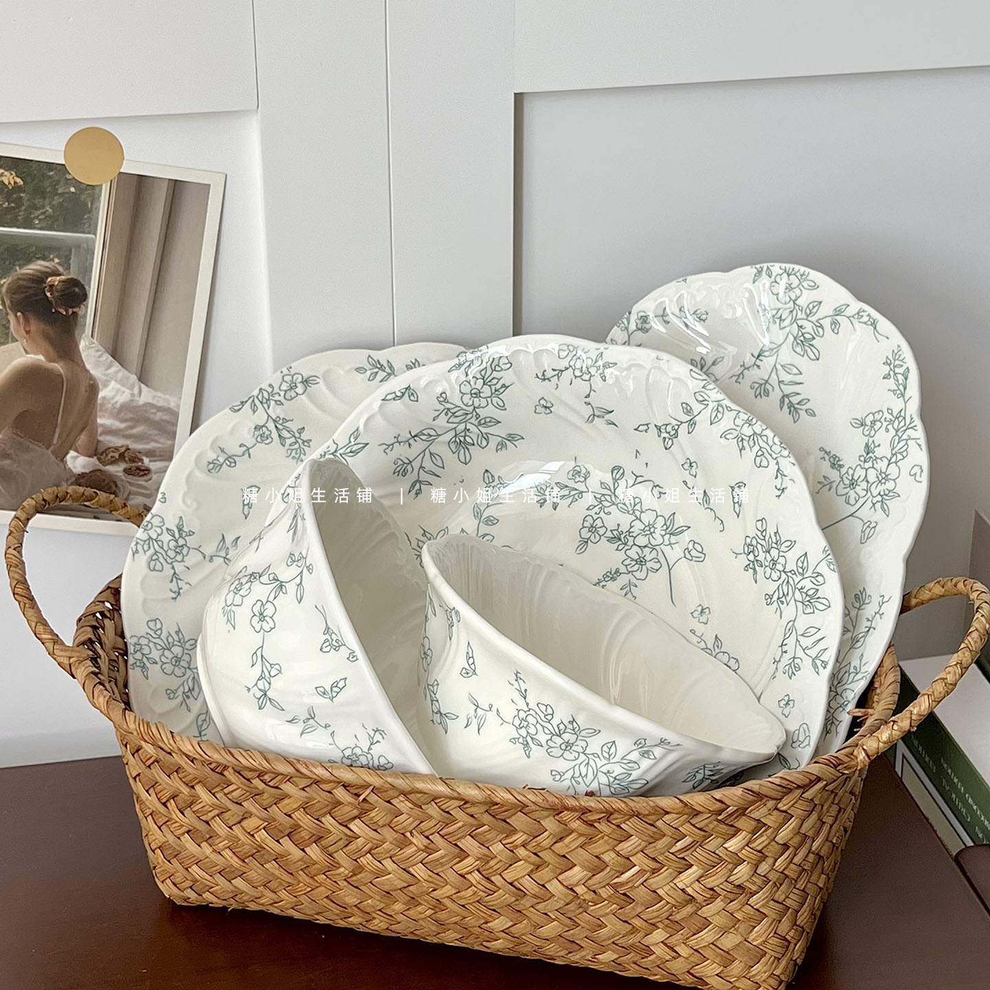 糖小姐 法式复古陶瓷盘子家用高级感碗盘餐具ins雾蓝花卉花边餐盘