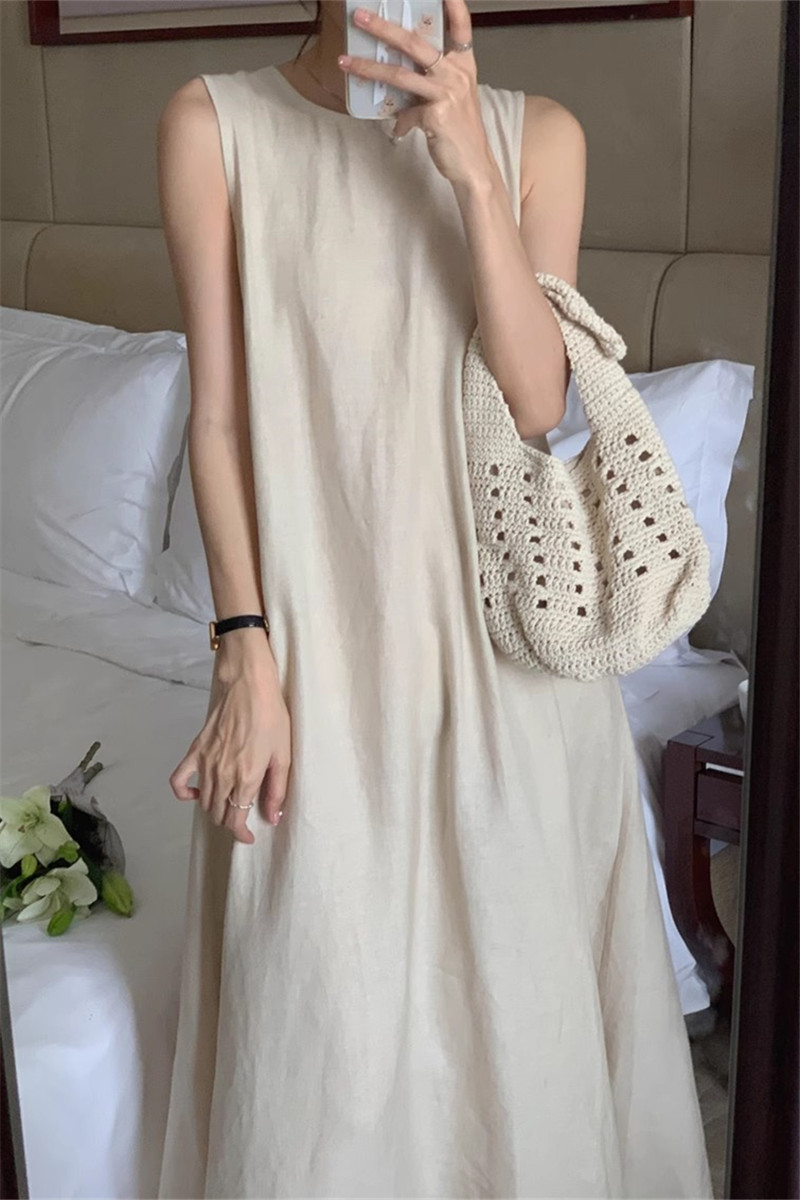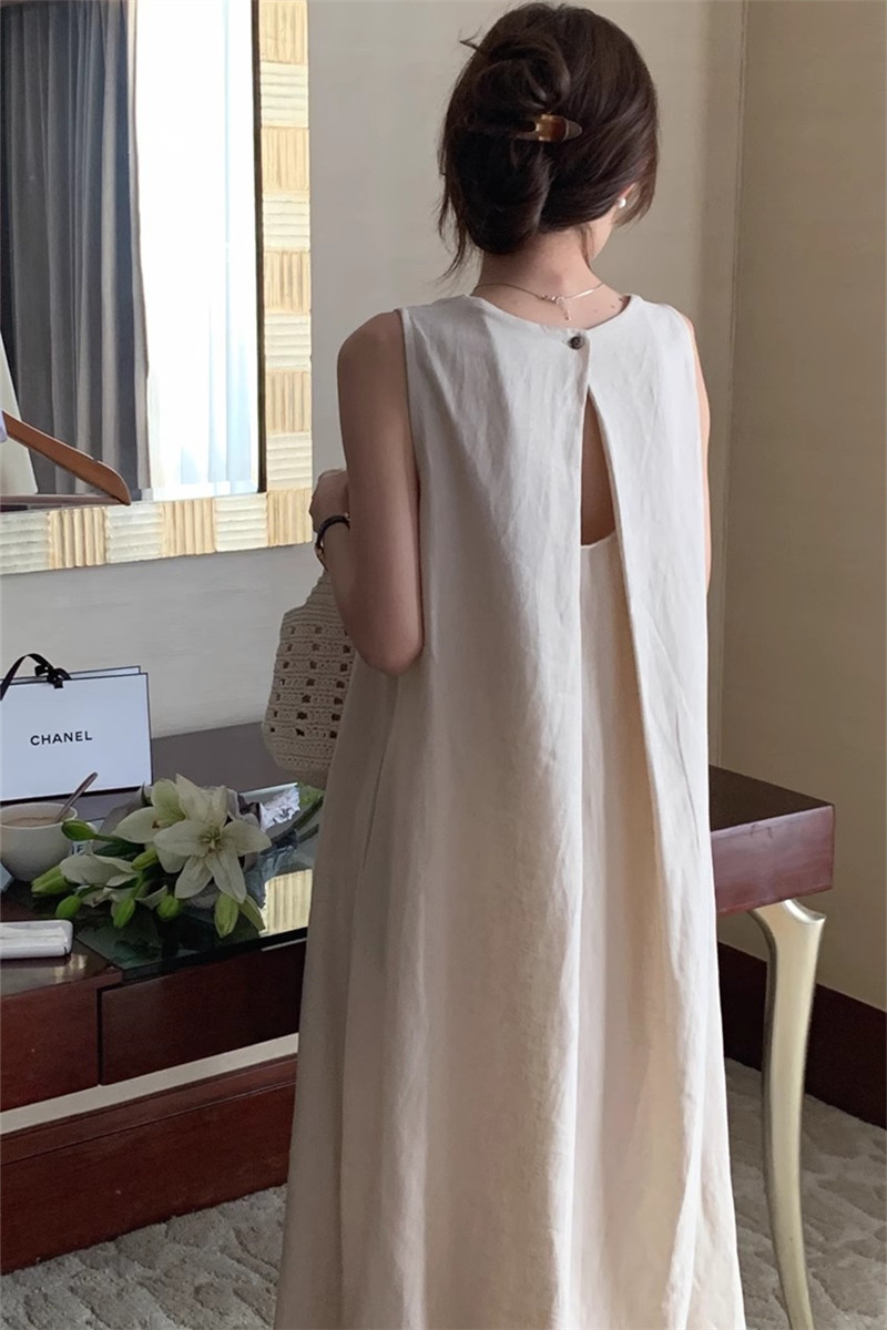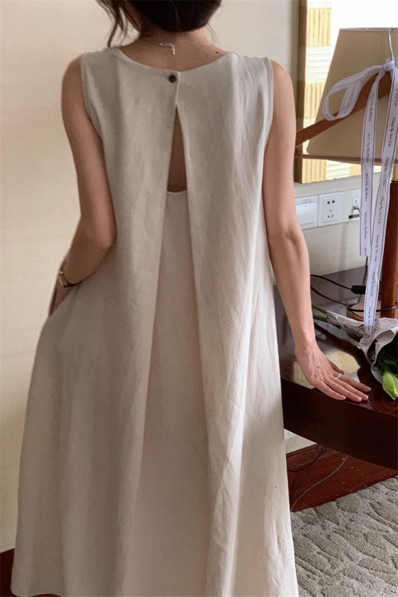 夏季新款设计感无袖棉麻连衣裙A字裙露背休闲显瘦背心裙亚麻长裙