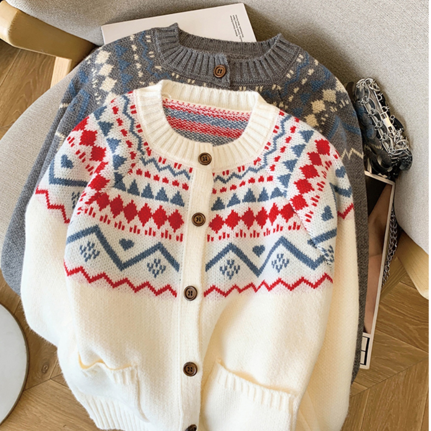 复古印花费尔岛圆领针织开衫女秋冬2025新款加厚宽松软糯毛衣外套