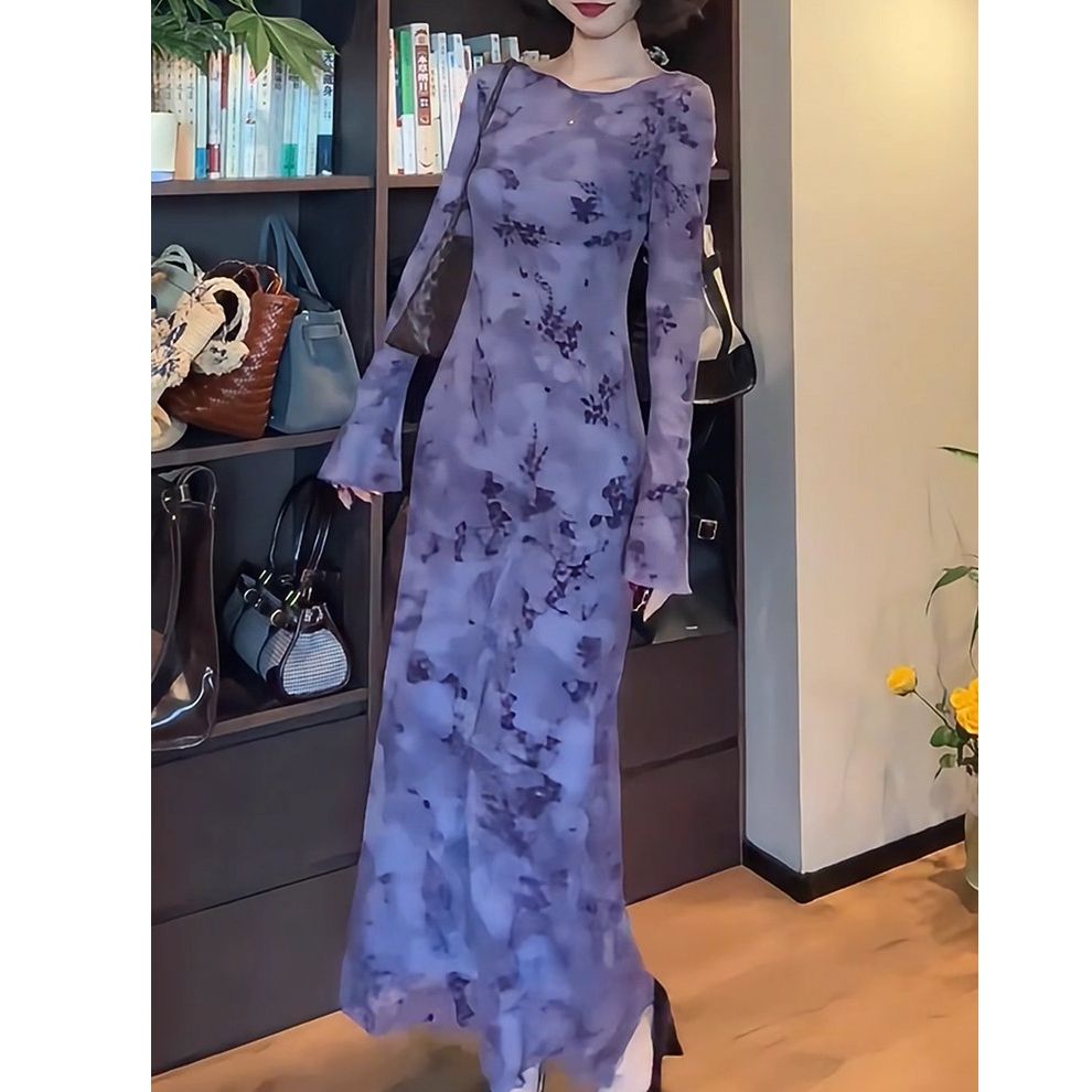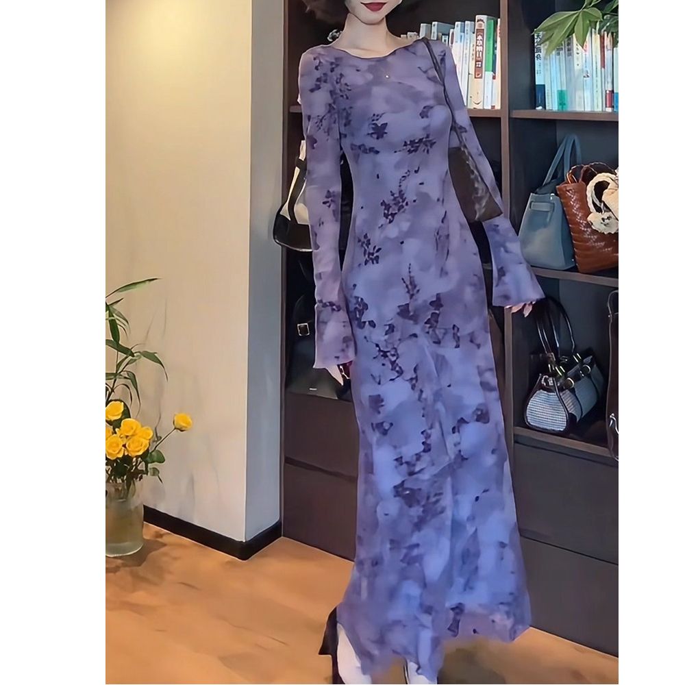 2025年秋季气质名媛高级感个性印花风情万种紫色圆领超漂亮连衣裙
