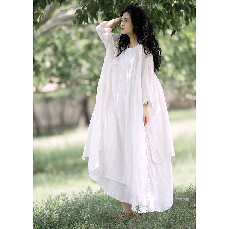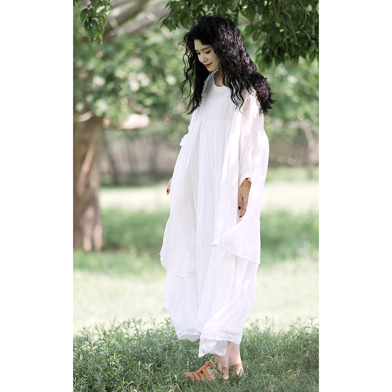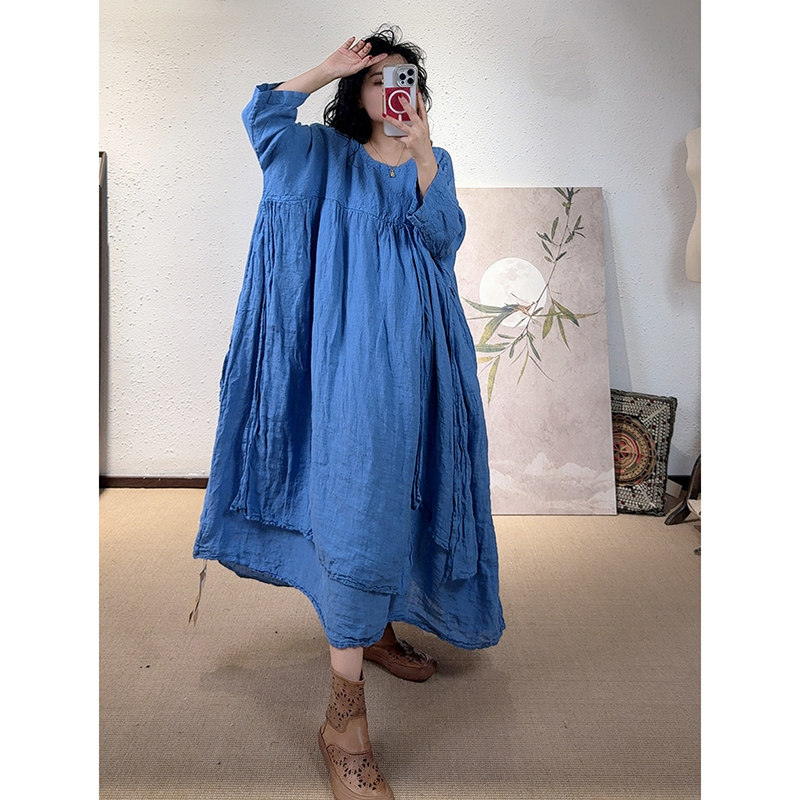 YIMIAN 时髦层次亚麻“湛蓝海洋”松弛感高贵显瘦连衣裙2625269