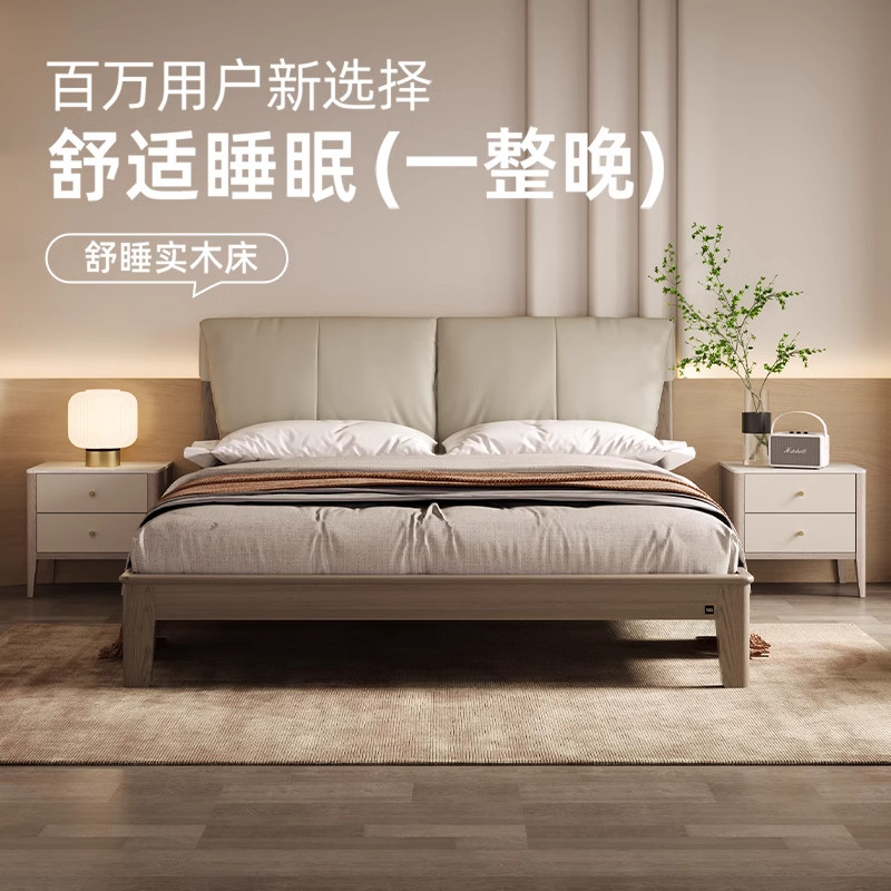 顾家家居实木白蜡木全实木中古风轻奢简约头层牛皮软包主卧双人床
