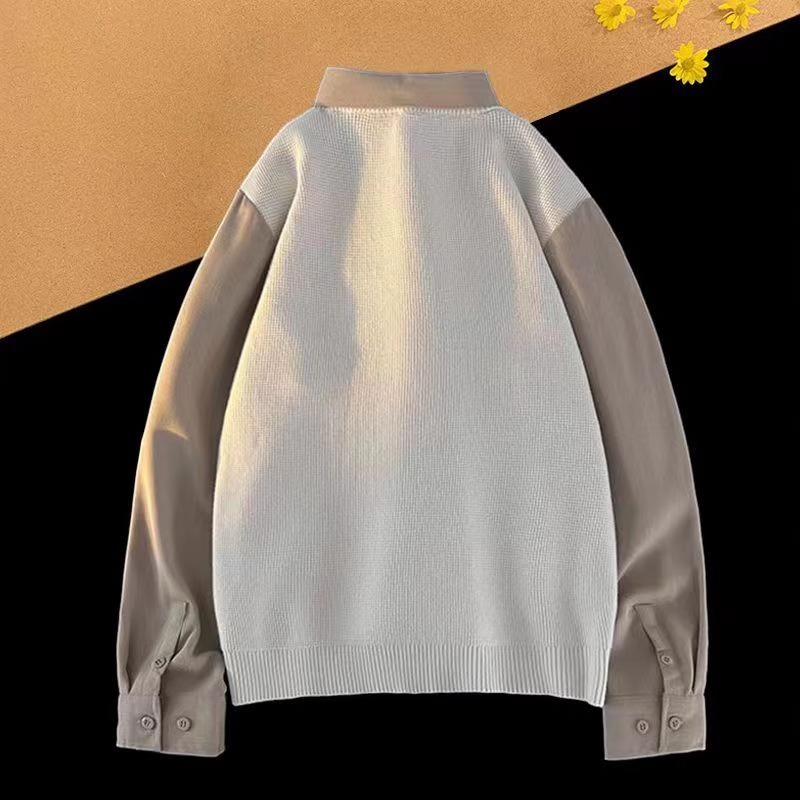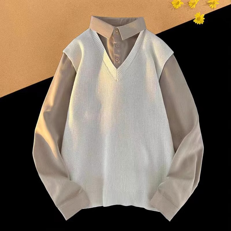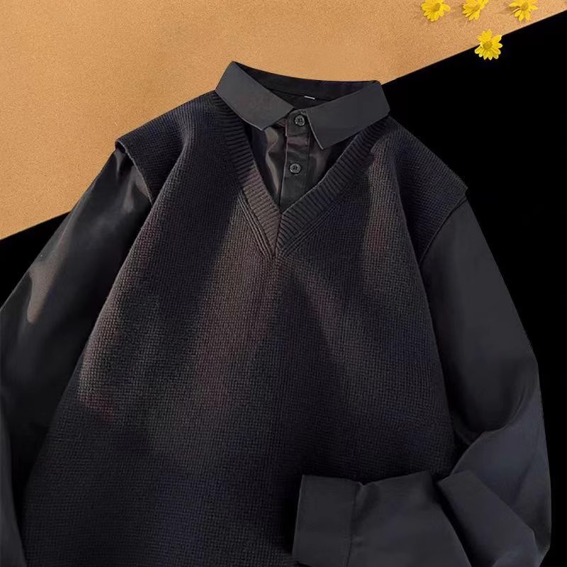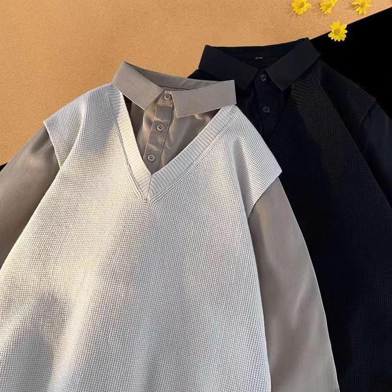 特大码300斤假两件毛衣拼接衬衫男春秋美式学院风高级感针织背心2