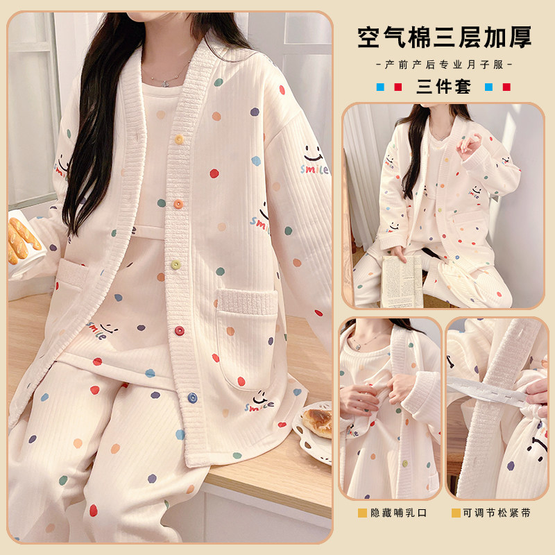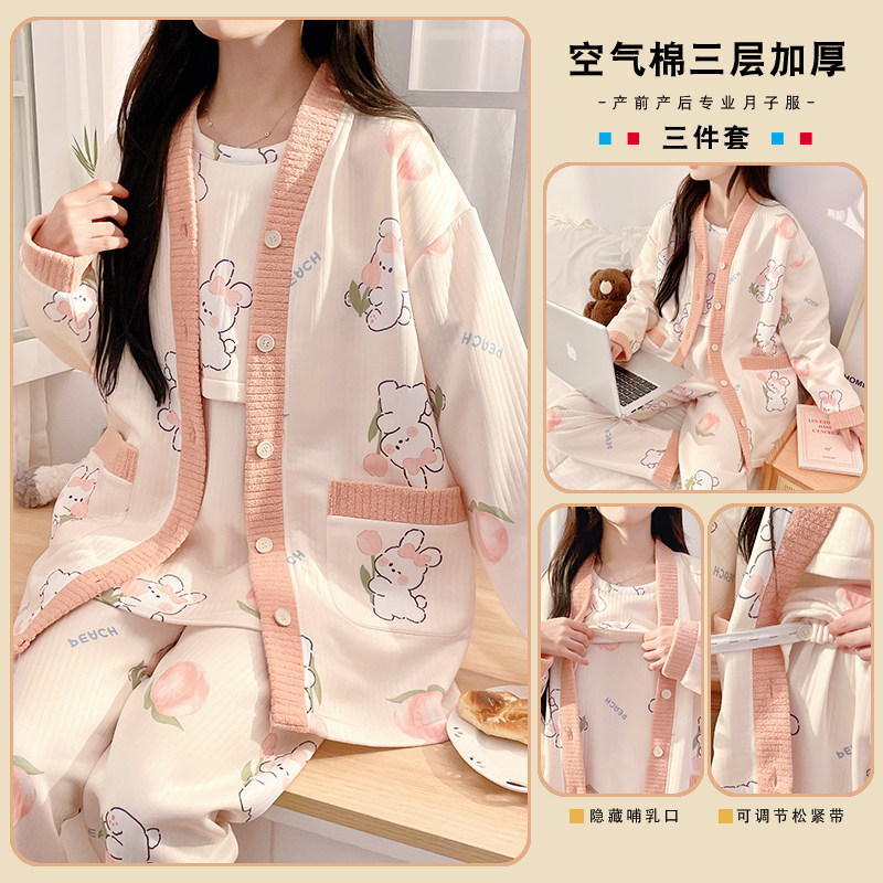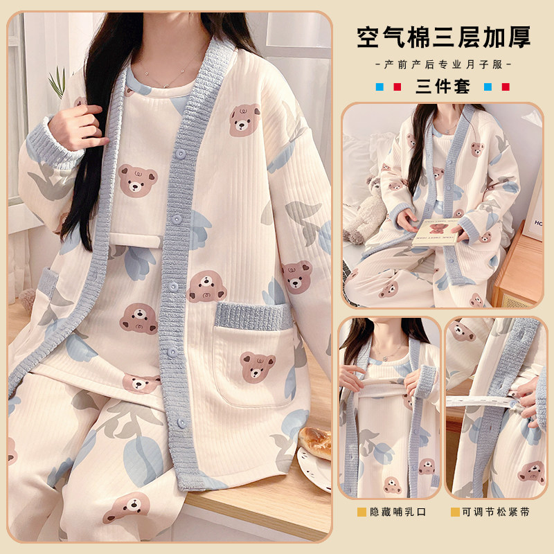 三件套空气棉春秋冬季加厚纯棉产后喂奶哺乳月子服孕妇睡衣怀孕期