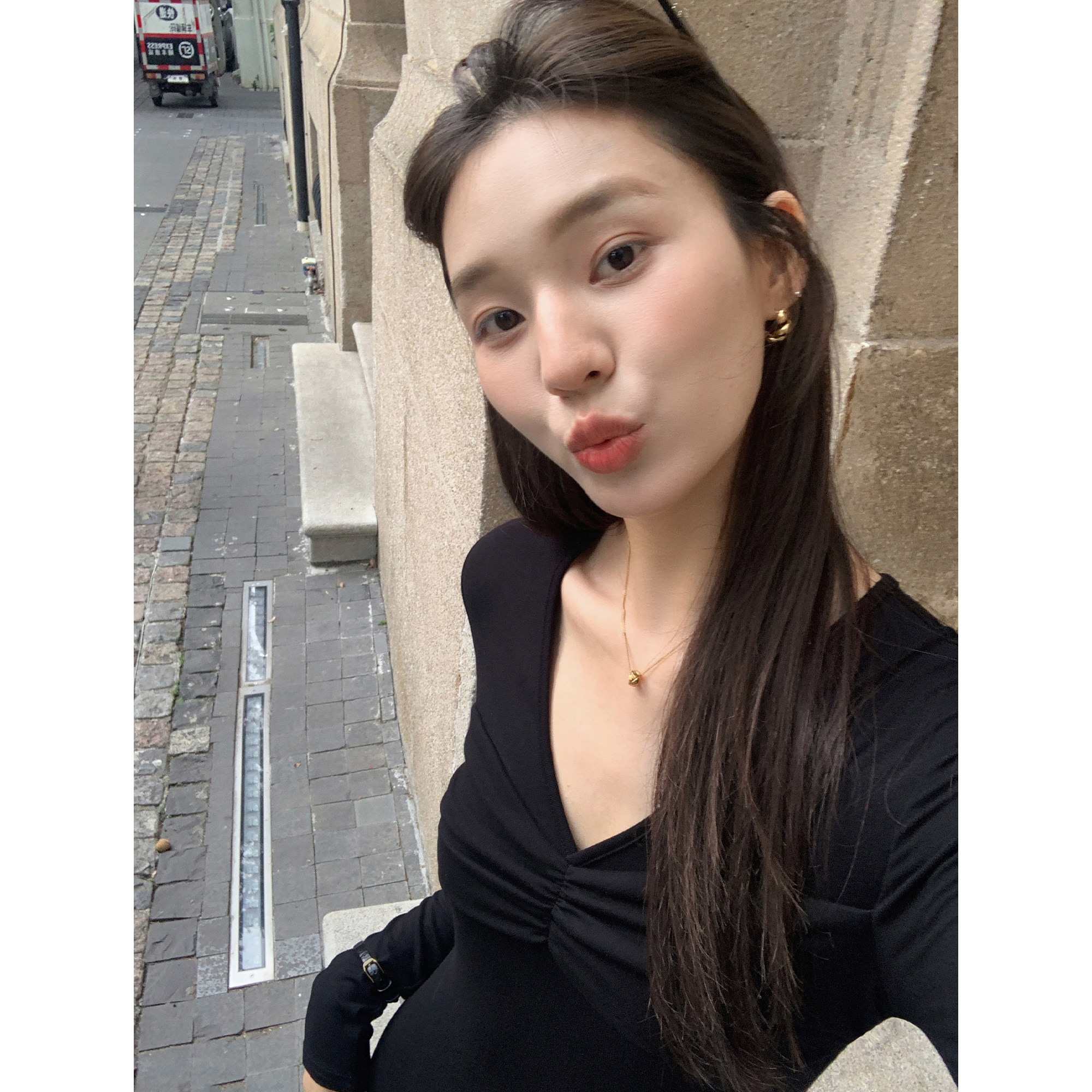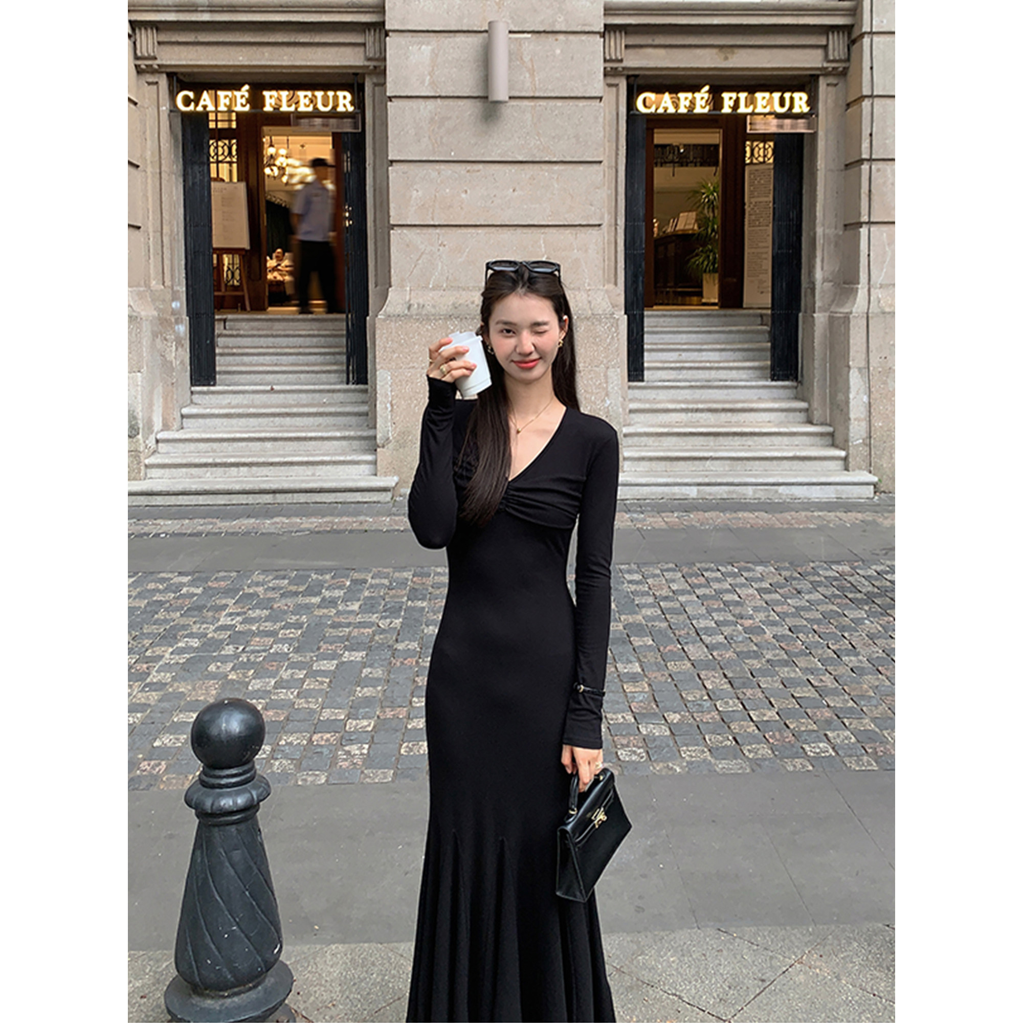 MULVAN 黑色针织v领连衣裙女长袖修身显瘦性感气质包臀鱼尾裙长裙