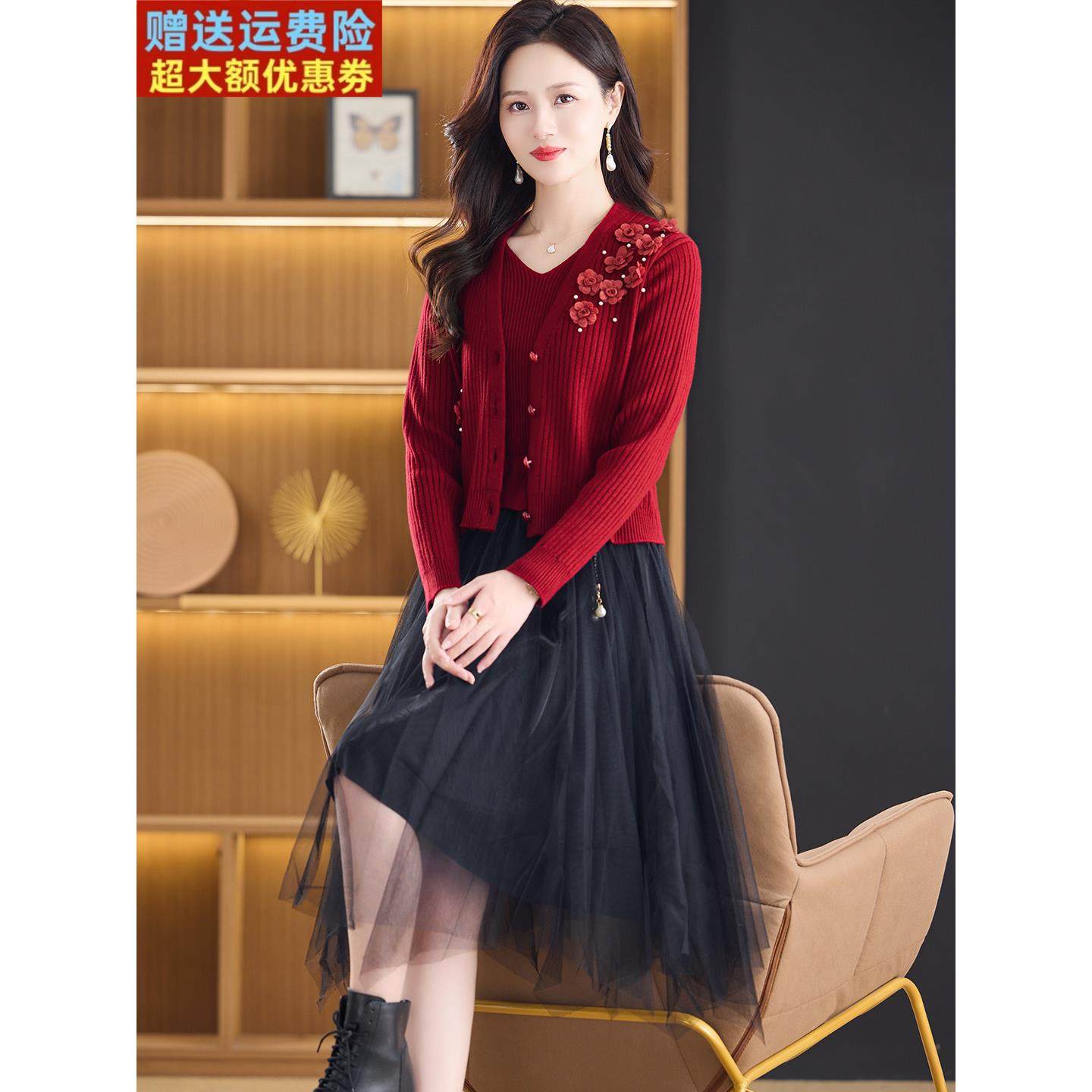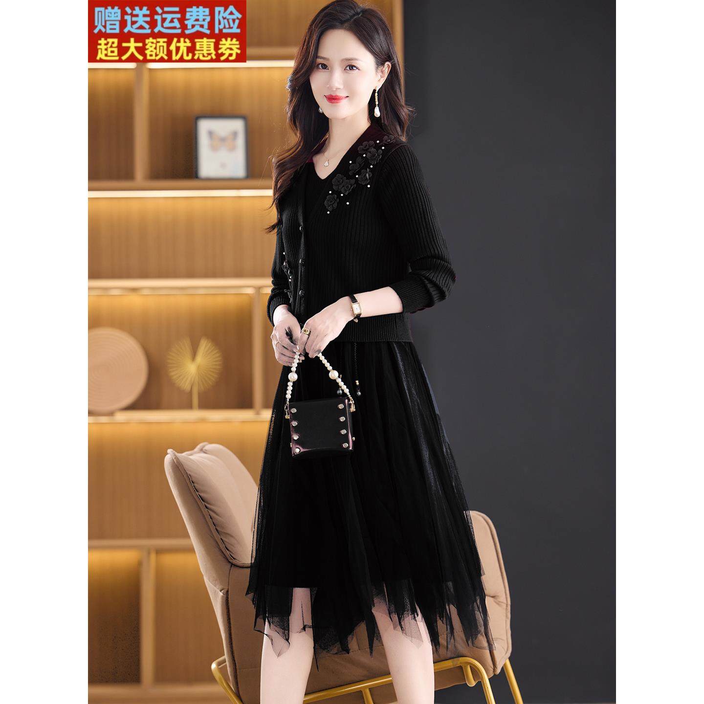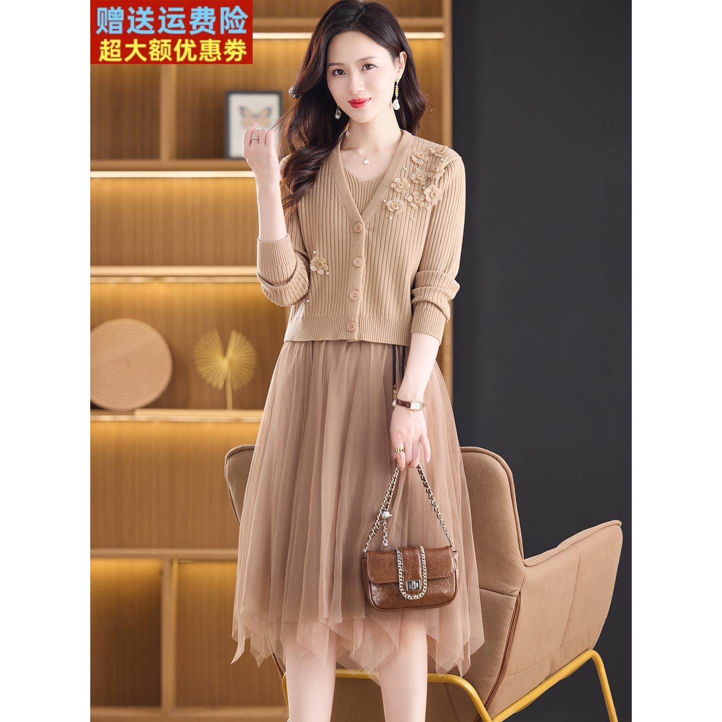 网纱针织连衣裙女两件套春秋季2025新款小个子妈妈毛衣打底套装裙