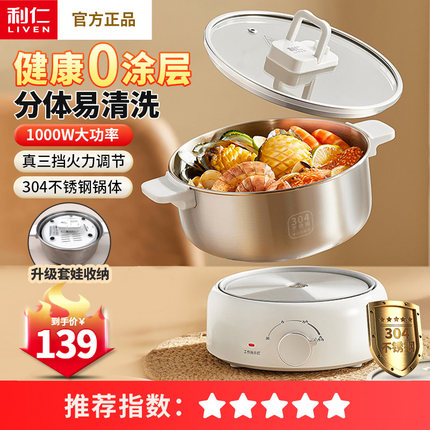 利仁电煮锅不锈钢电火锅小型多功能学生宿舍煮面小电锅分体泡面锅