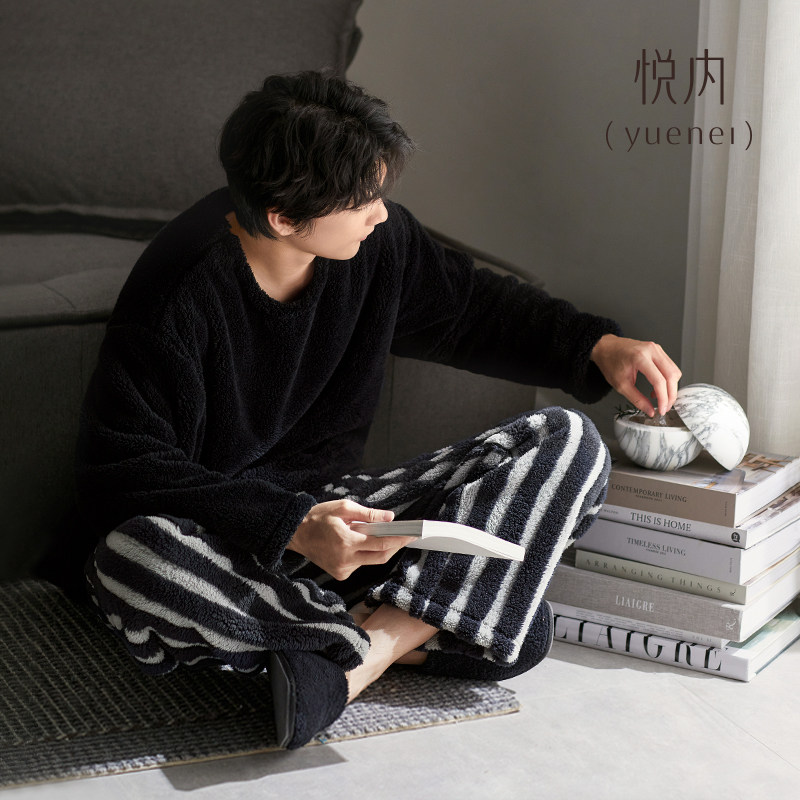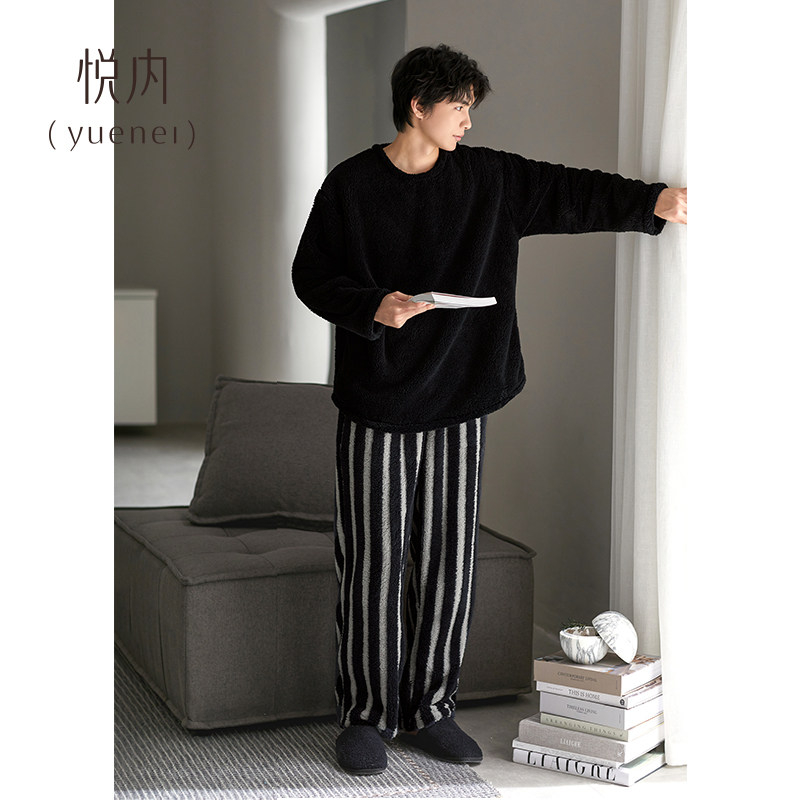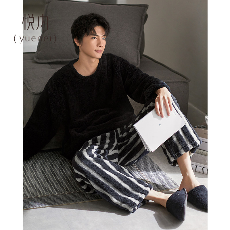 悦内睡衣男士秋冬款冬季珊瑚绒加绒加厚法兰绒毛绒圆领套头家居服