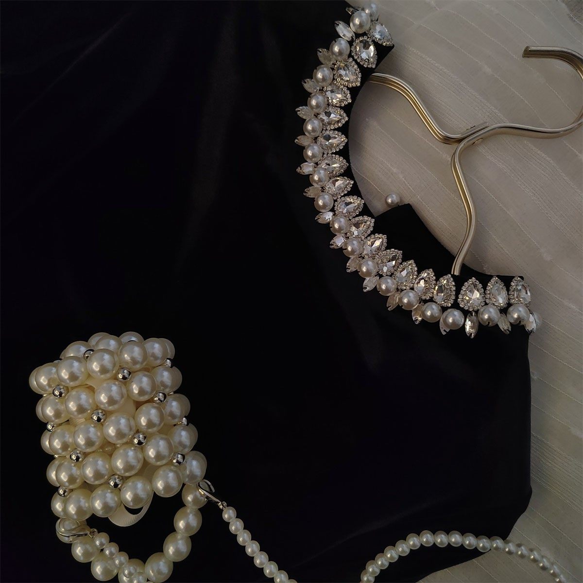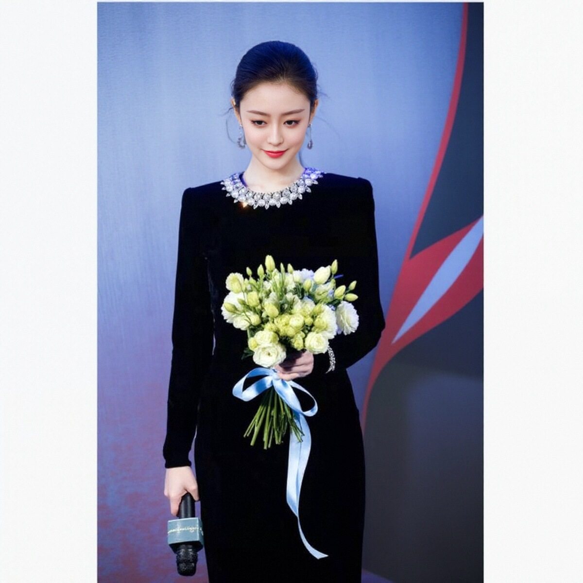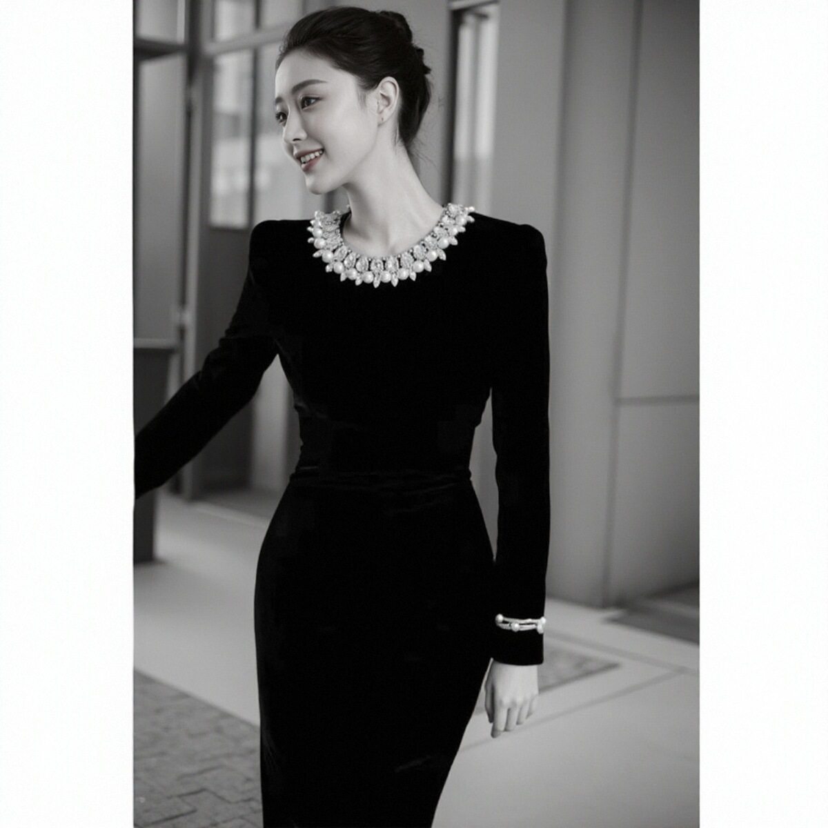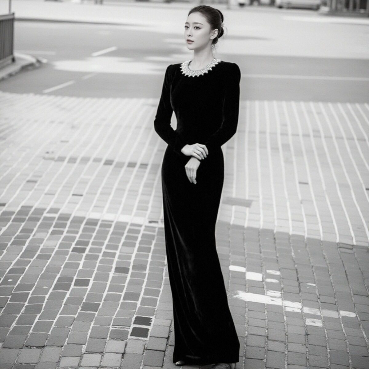 高端明星同款礼服裙长款轻奢钉珠长袖丝绒连衣裙秋冬年会宴会晚装
