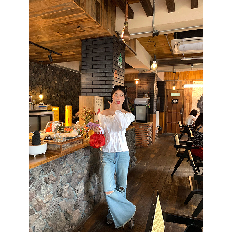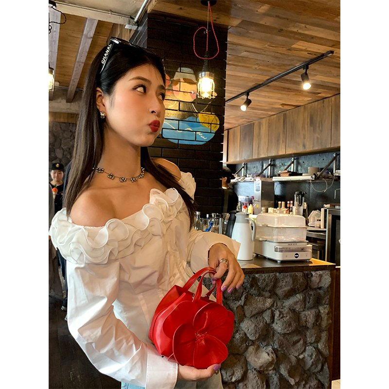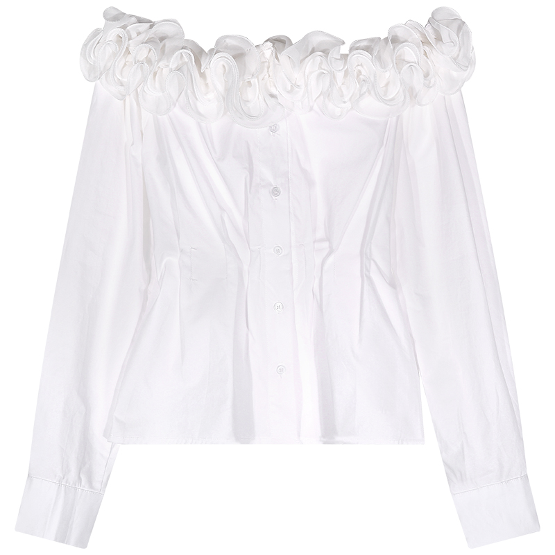 今屿花花白色一字肩衬衫2025新款女夏季法式长袖衬衣套头收腰花边