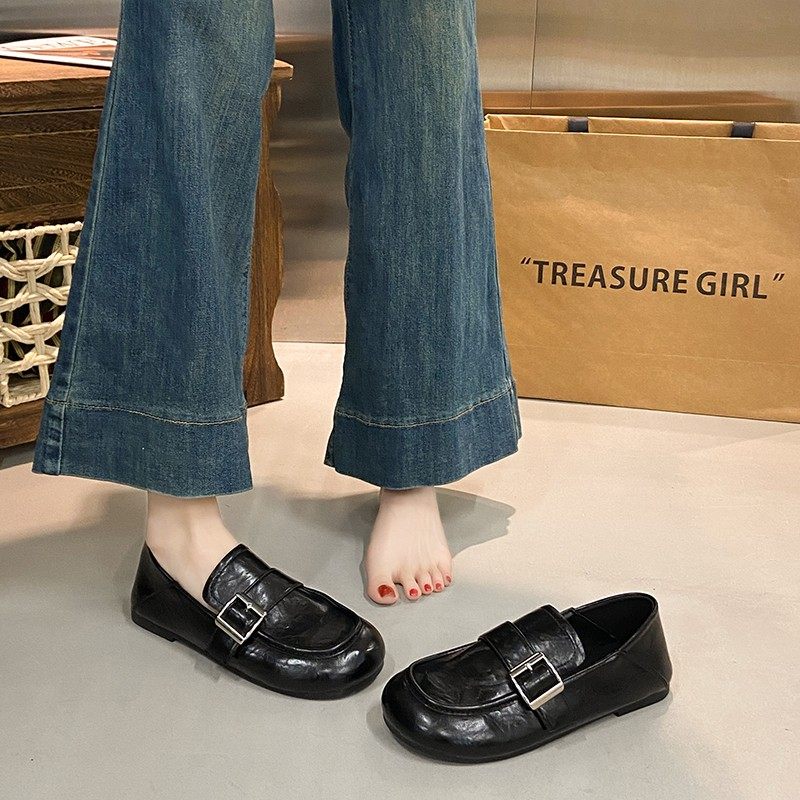 英伦风真皮乐福鞋女圆头平底鞋春秋女鞋低跟一脚蹬单鞋软底豆豆鞋