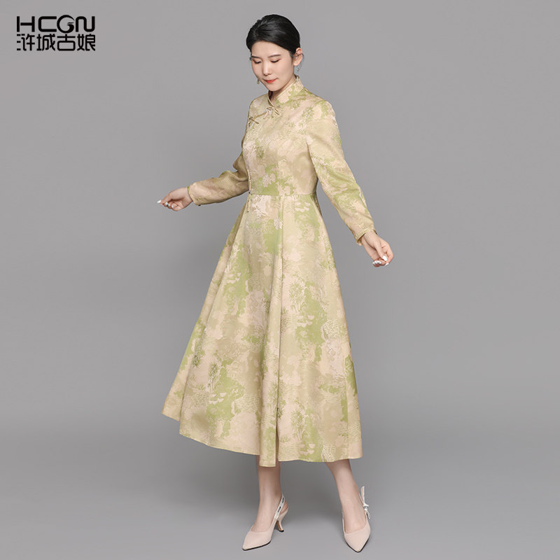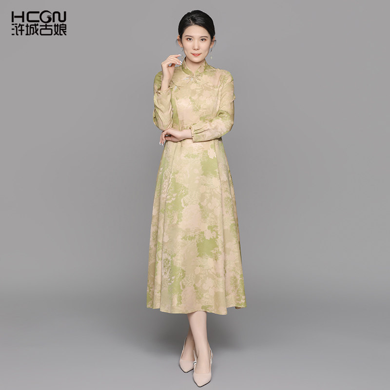浒城古娘新款桑蚕丝印花气质立领长袖新中式国风旗袍连衣裙女春秋