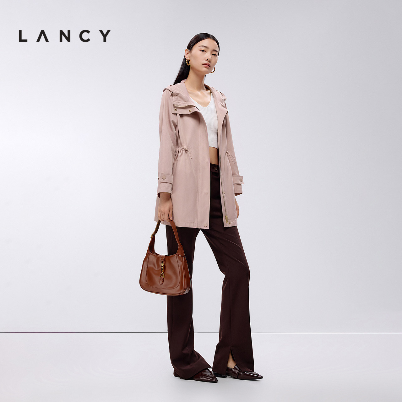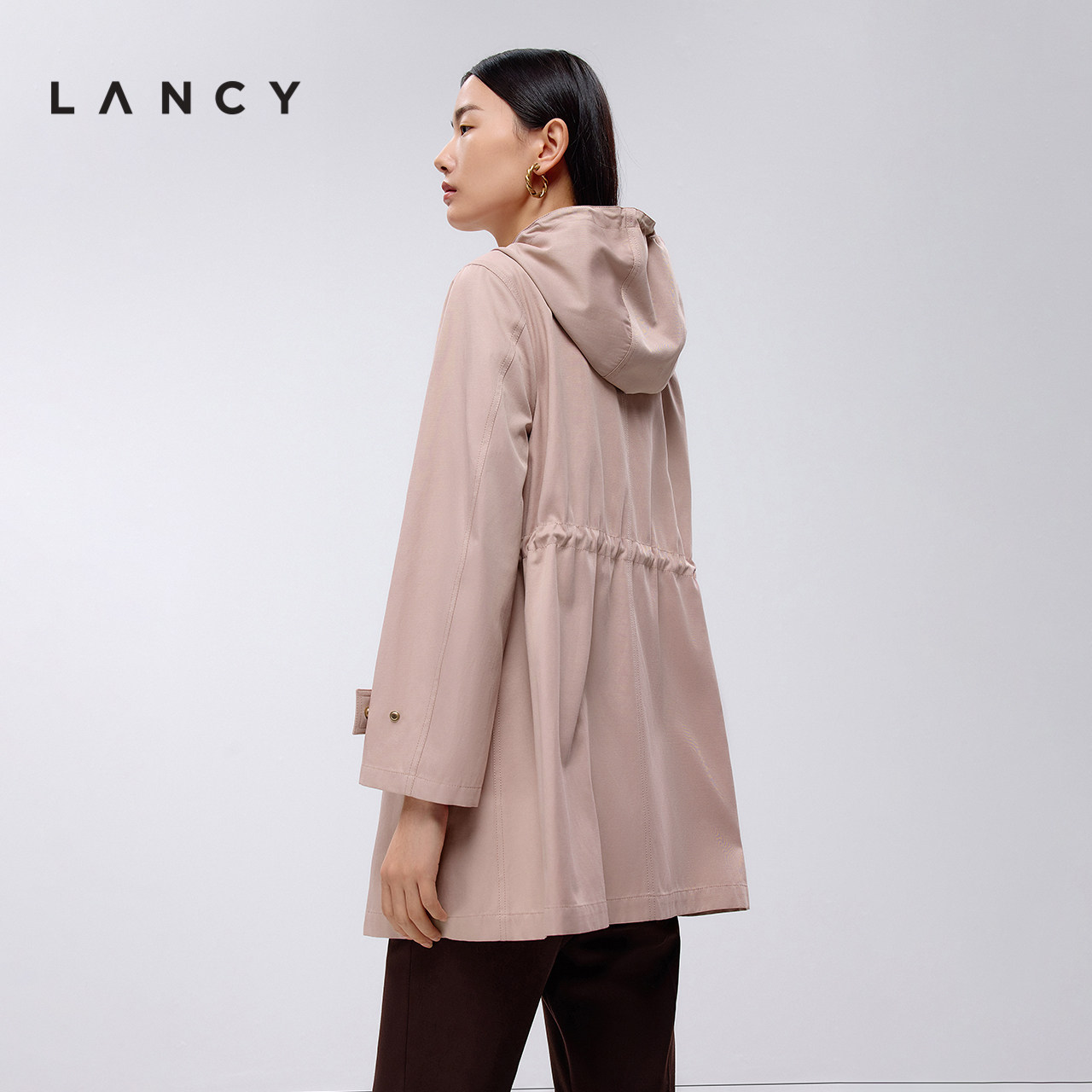 LANCY/朗姿2025春新款宽松休闲短款收腰风衣女高级感连帽棉外套