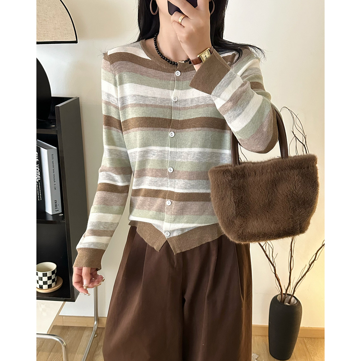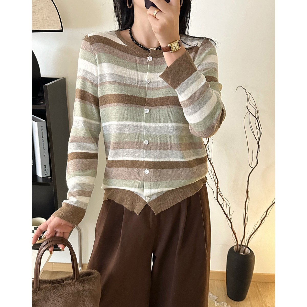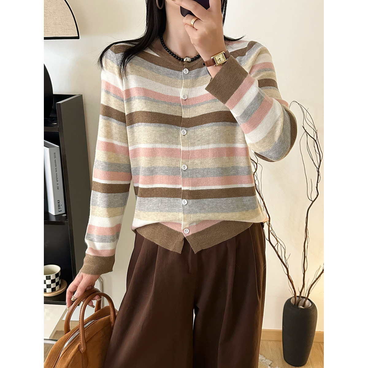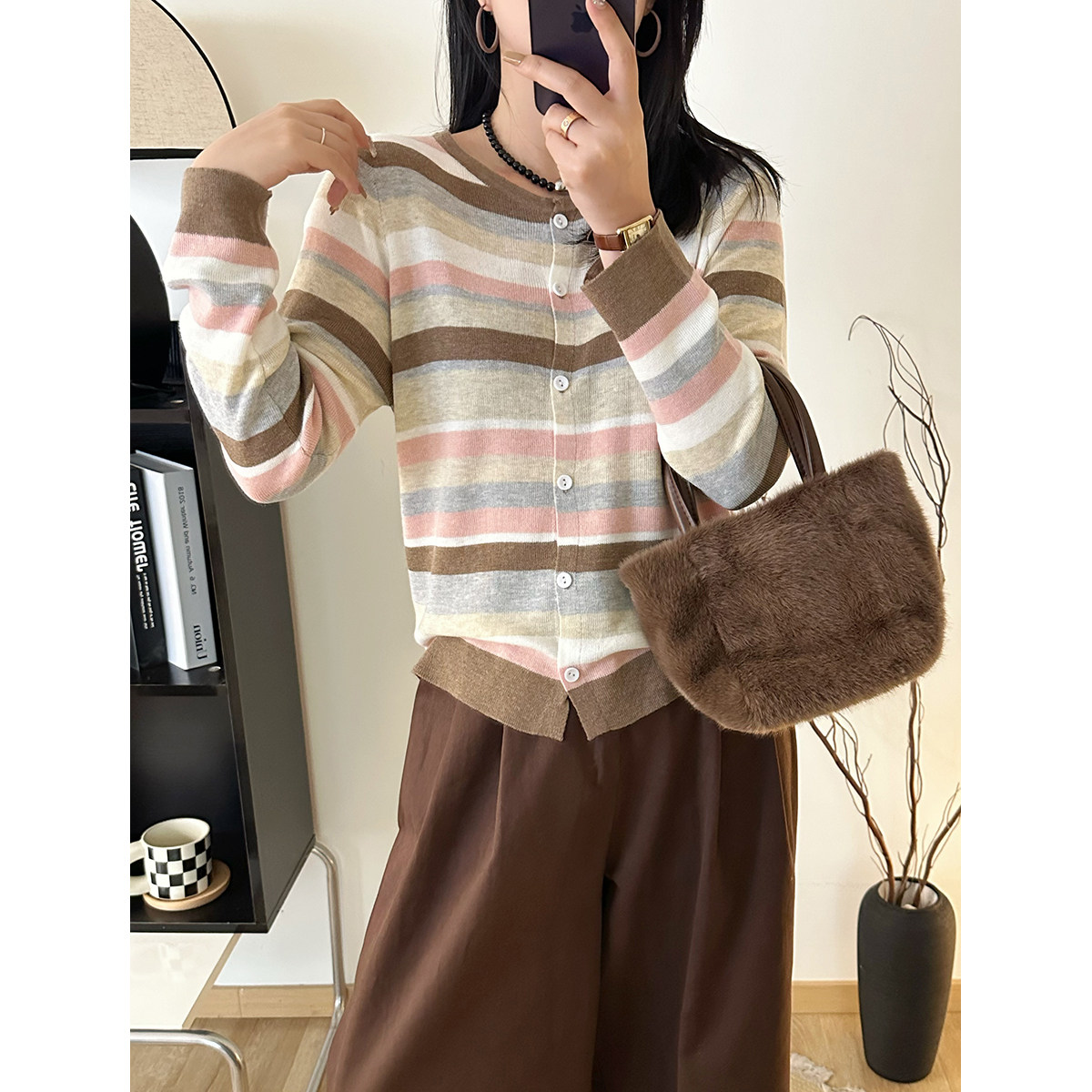 法式撞色圆领条纹针织女士2025春季新款薄款女小外搭毛衣开衫上衣
