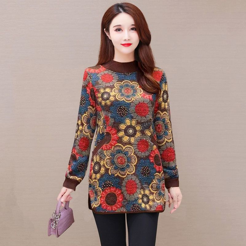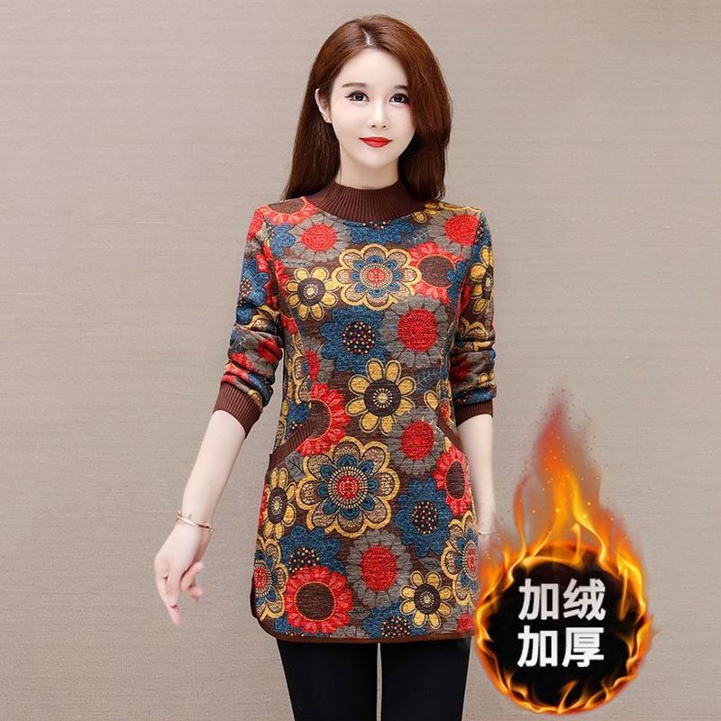 加绒加厚中长款打底衫女中年妈妈装大码女装外穿宽松复古印花上衣