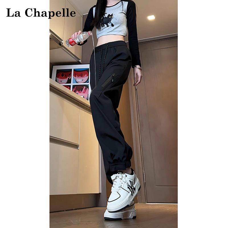 拉夏贝尔黑色速干工装裤女秋冬2025新款直筒宽松休闲运动冲锋裤子
