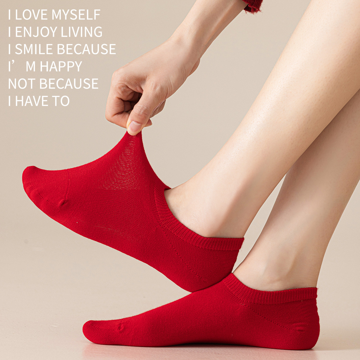 100%纯棉大红酒红色船袜女