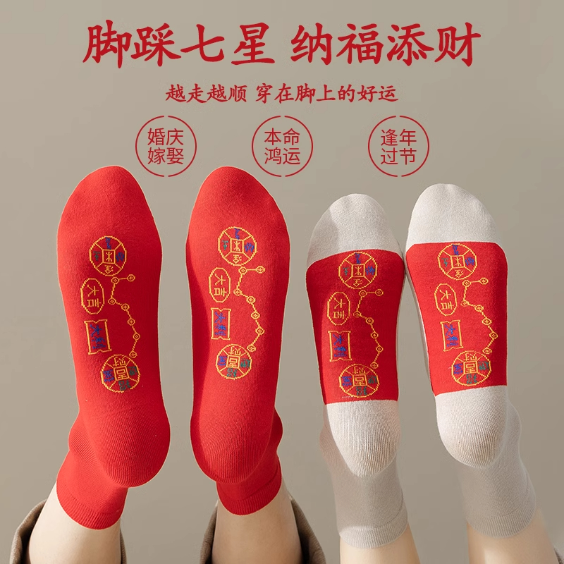 2026本命年脚踏七星红袜子男女秋冬纯棉中筒袜结婚属马年情侣长袜