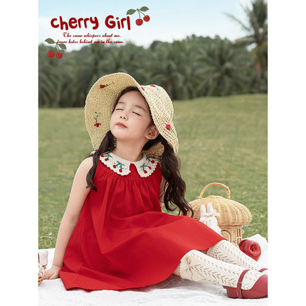 幼悠女童毛织樱桃翻领大裙摆背心裙夏季俏皮可爱清爽无袖连衣裙潮