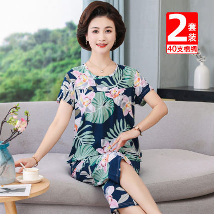 中老年妈妈夏装睡衣女款夏季棉绸套装短袖人造棉可外穿奶奶家居服