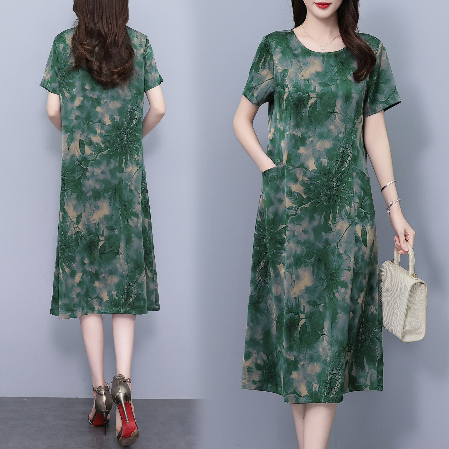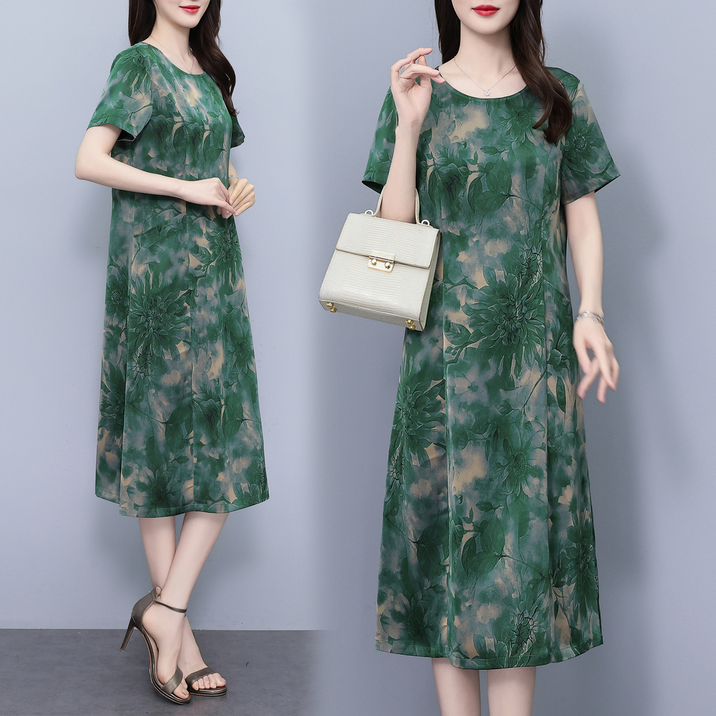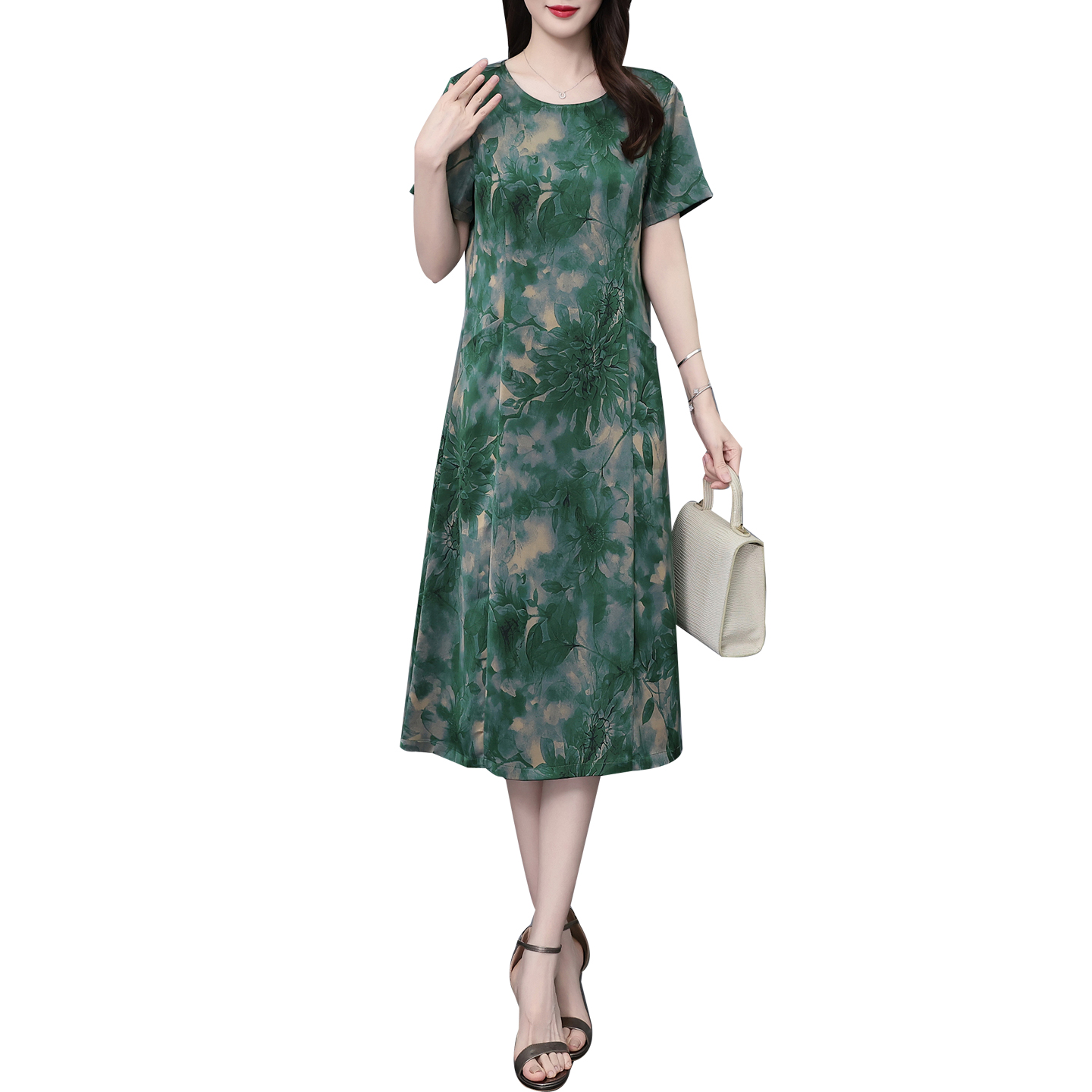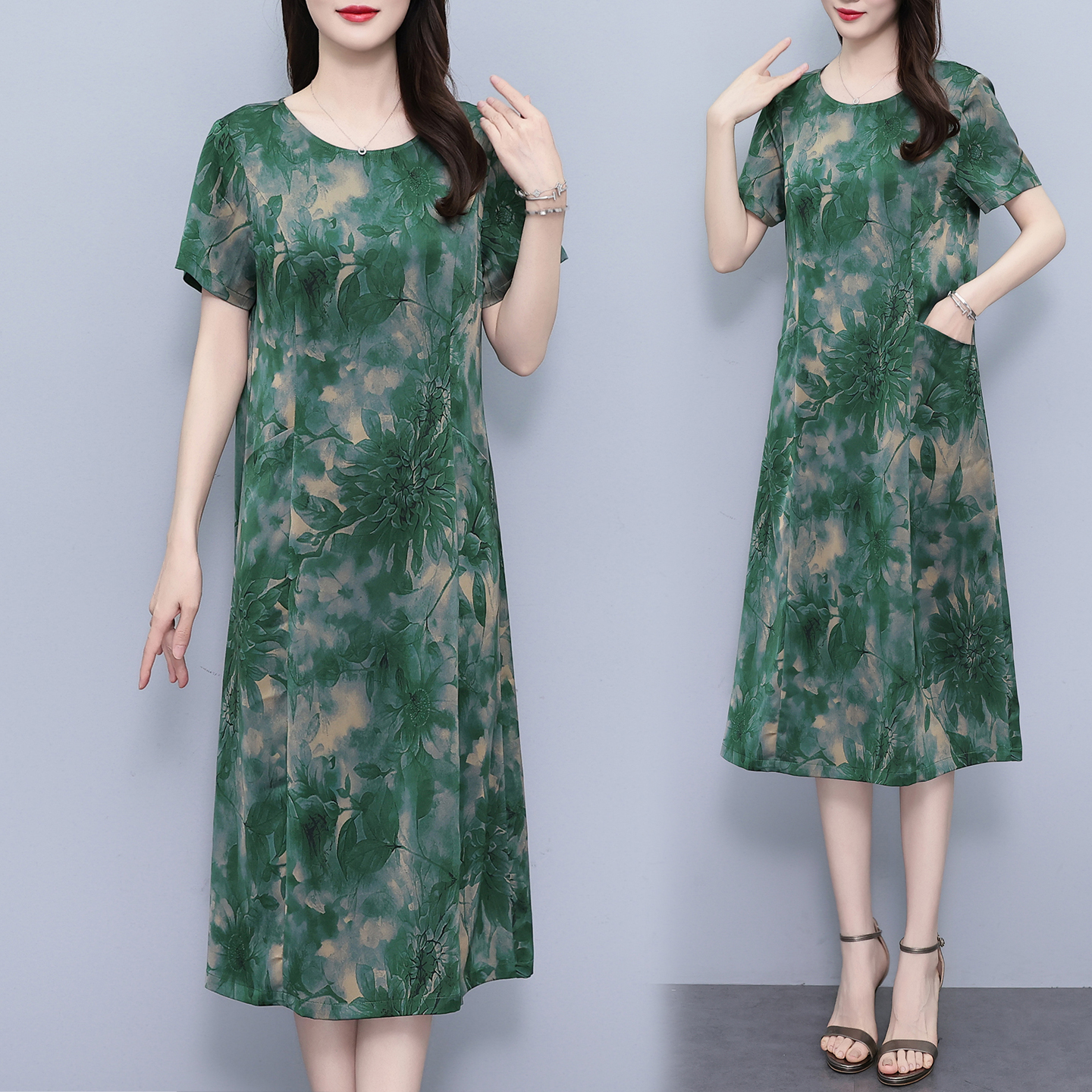 中老年桑蚕丝短袖连衣裙妈妈衣服