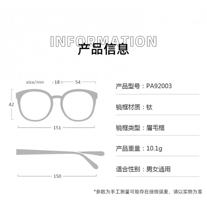 新款帕莎Prsr眼镜框男女全框圆脸纯钛超轻近视镜架眉毛框PA92003