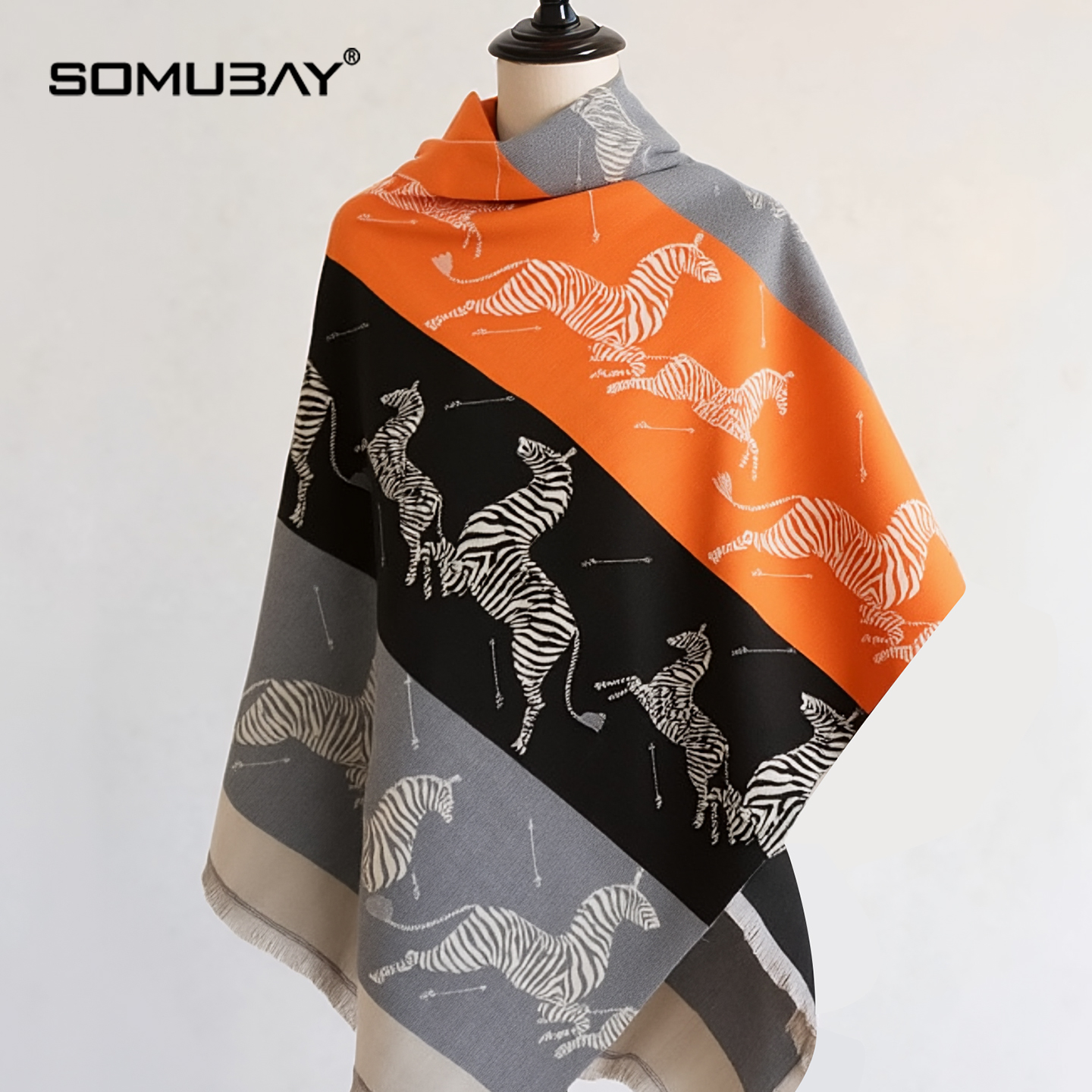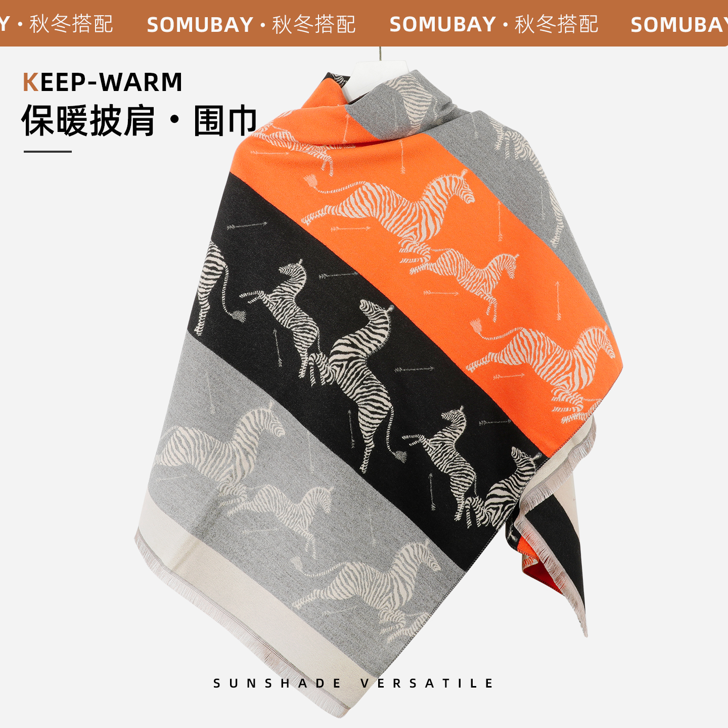 2025韩版新款秋冬季加厚保暖围巾撞色双面印花两用围脖气质披肩女