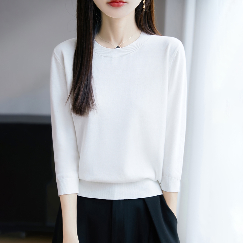 100%纯棉线七分袖针织衫女圆领半袖T恤春秋薄款宽松全棉打底上衣