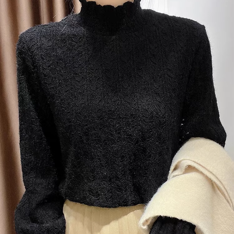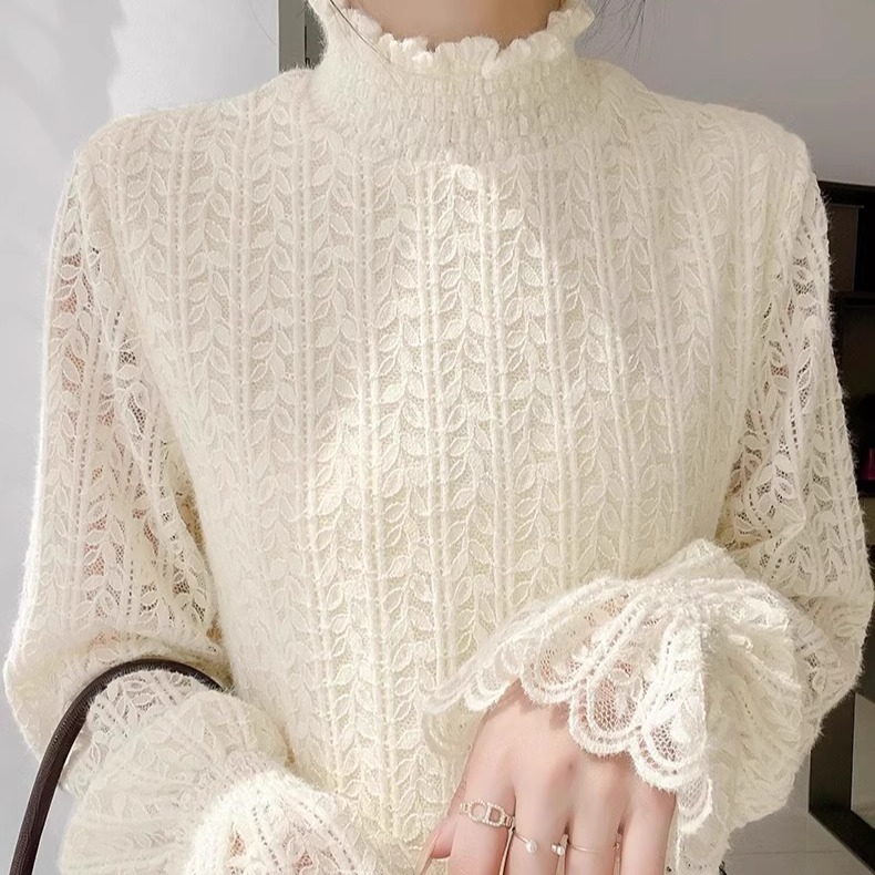 半高领加绒加厚蕾丝打底衫女秋冬季新款洋气磨毛小衫内搭叠穿上衣