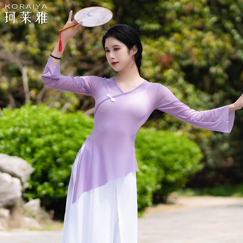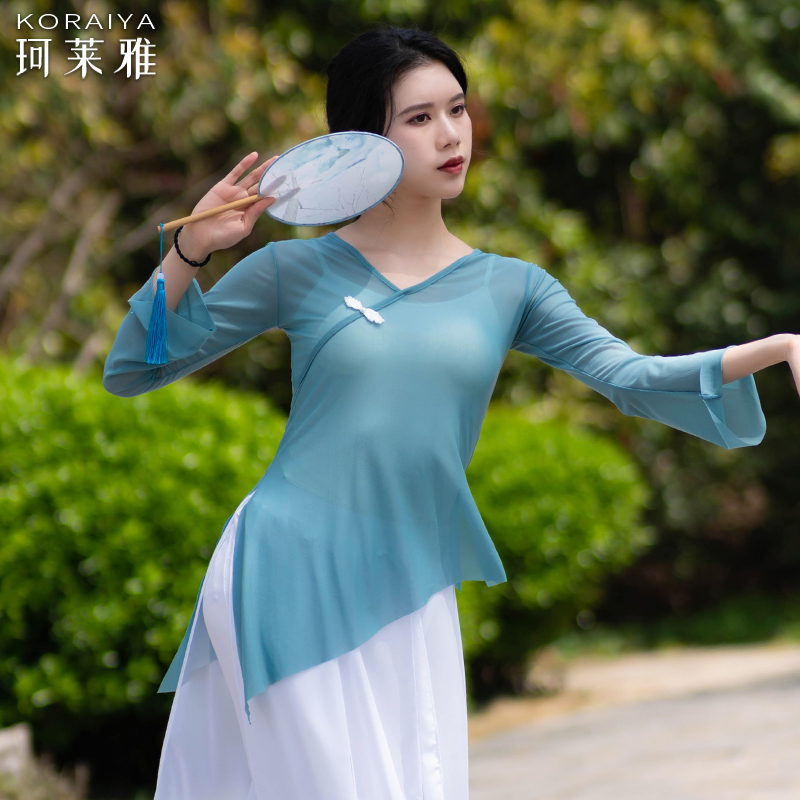 新选古典中国民h族风舞蹈身韵练功服女成人表演飘逸喇叭袖网纱衣