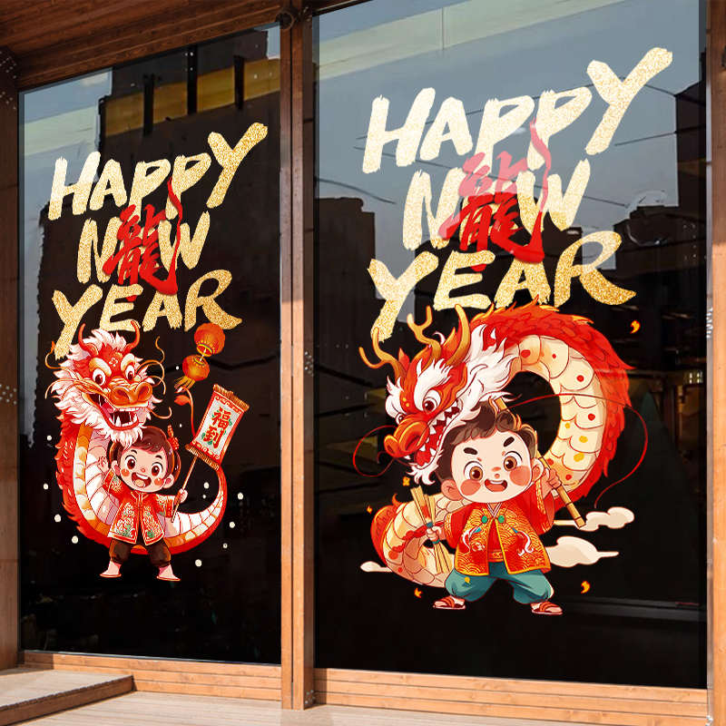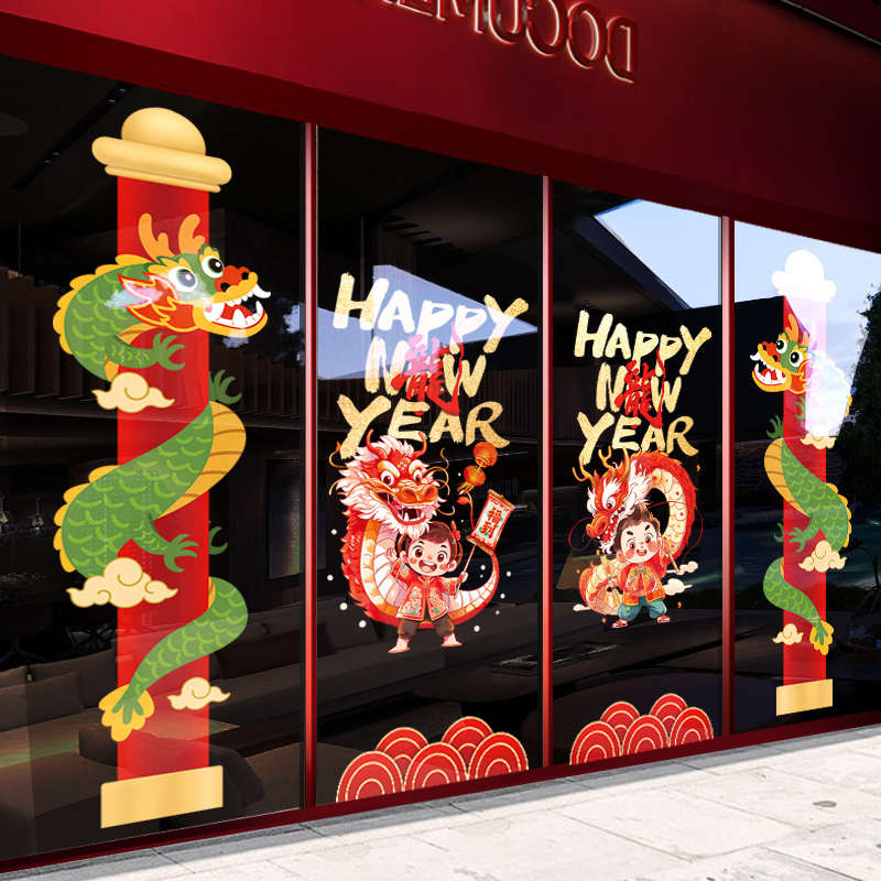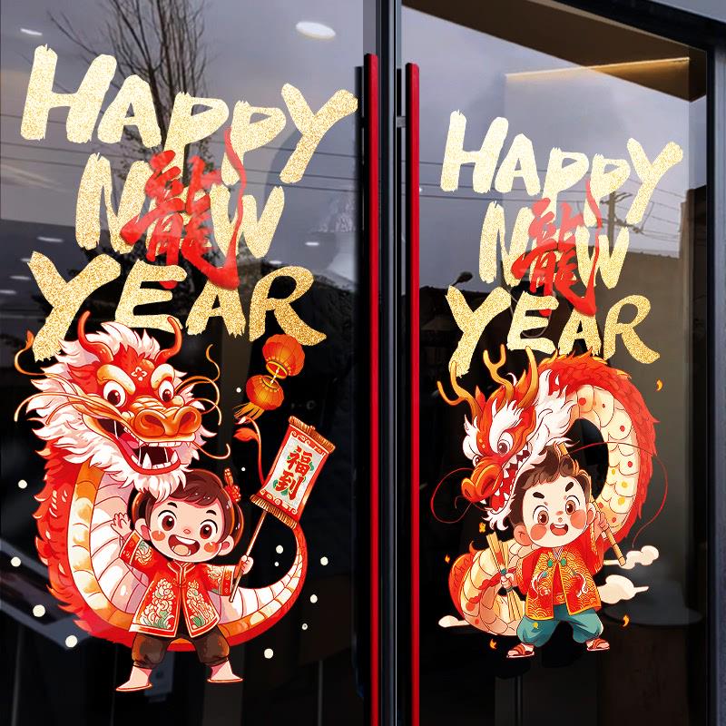 2024新年装饰橱窗户玻璃静电贴画龙年春节场景布置过年氛围窗花贴