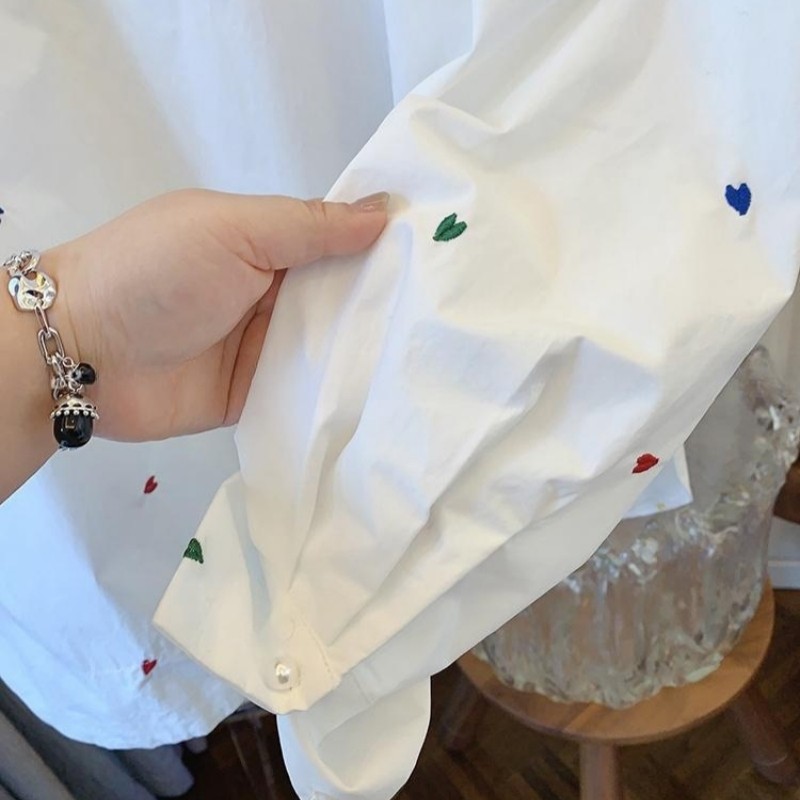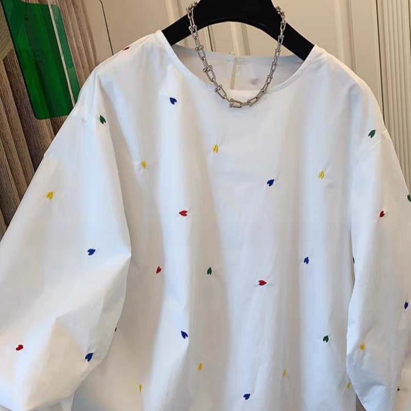 彩色爱心波点刺绣娃娃衫女2025春季新款圆领宽松套头白色衬衫上衣