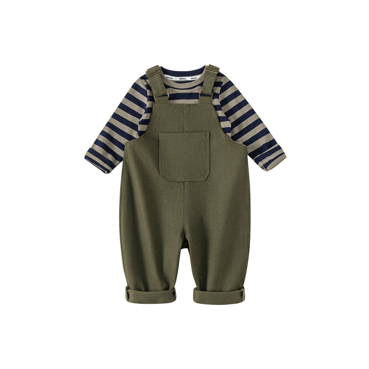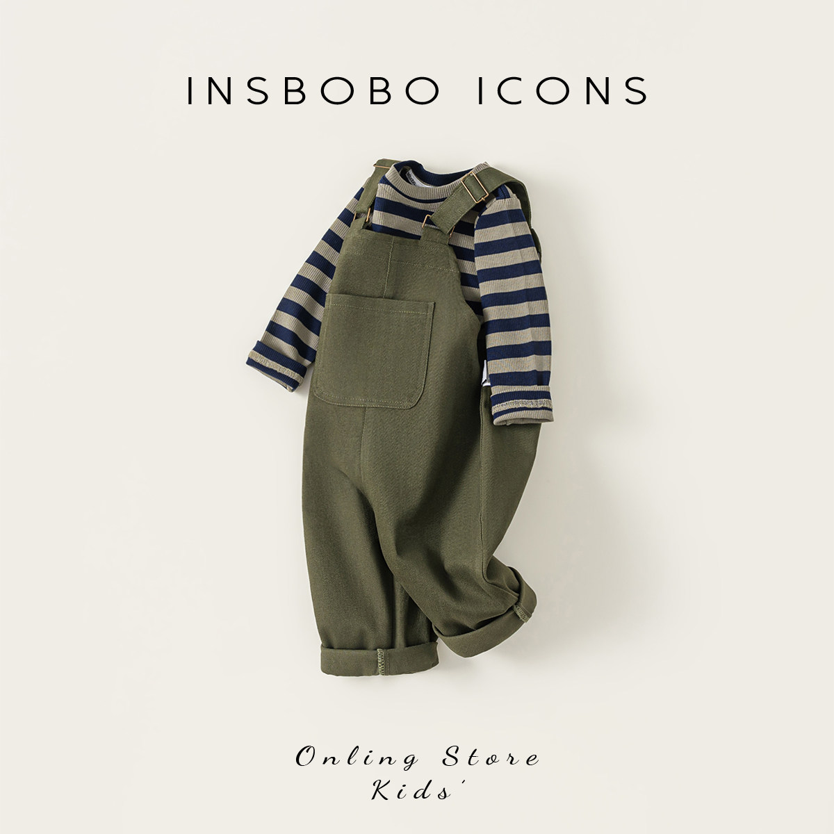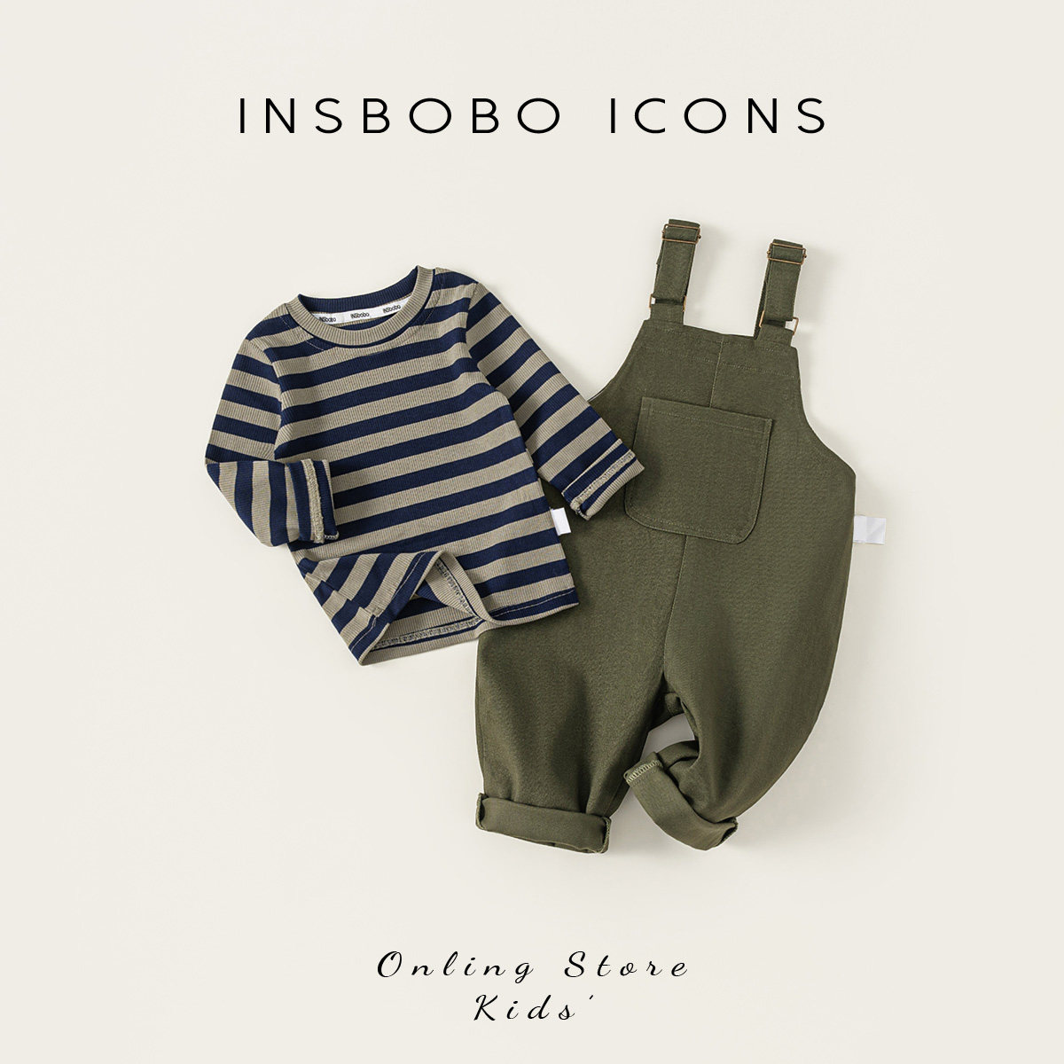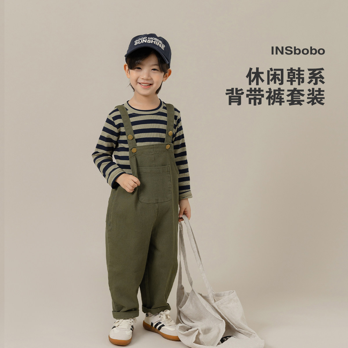 INSbobo女童春秋套装2025新款拼色条纹男童套装休闲背带裤套装潮