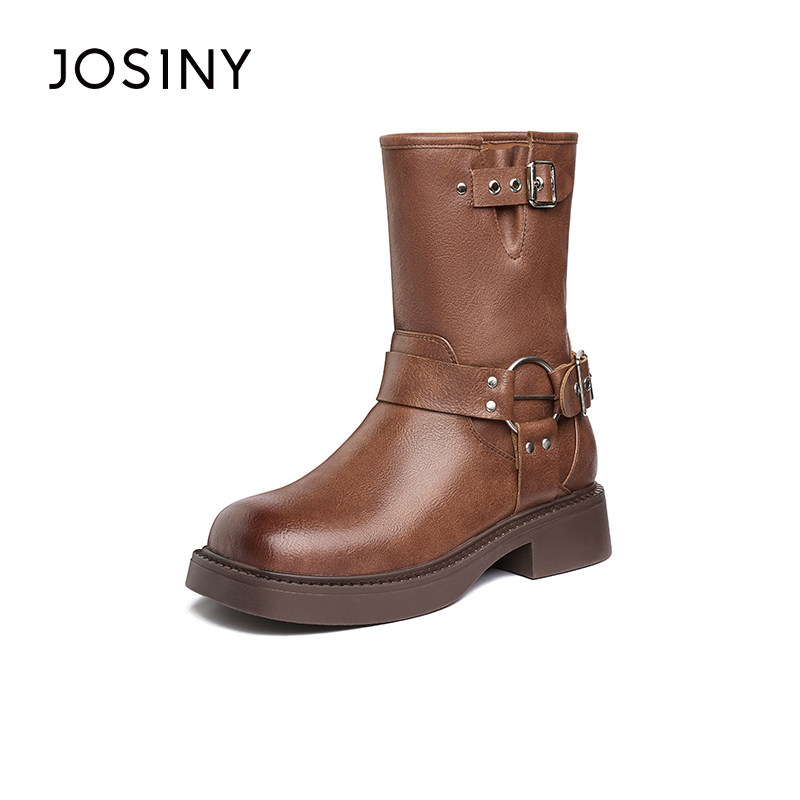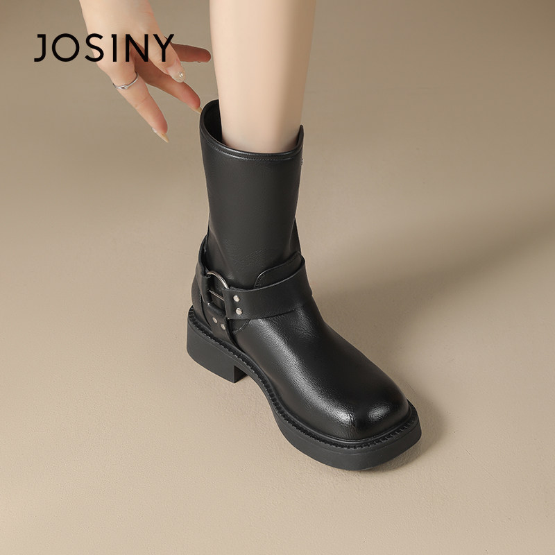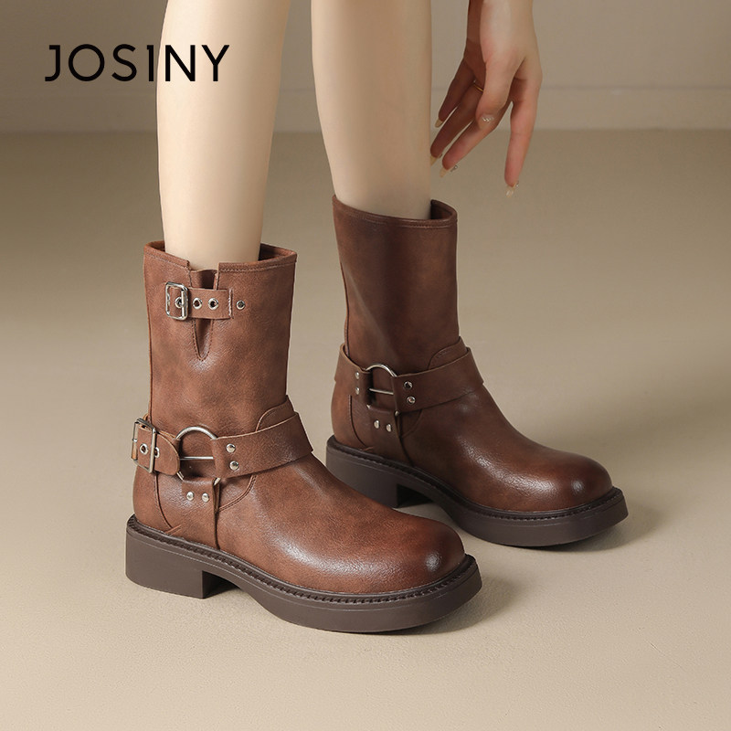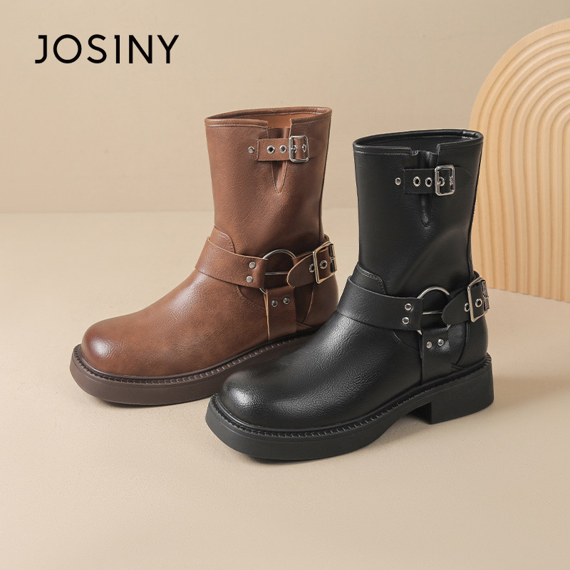 卓诗尼骑士靴女2025秋冬季新款英伦风复古百搭短靴显瘦皮带扣靴子