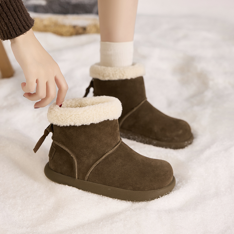 时尚厚底真皮加绒雪地靴女2025冬新款韩版百搭圆头棉鞋毛毛短靴子