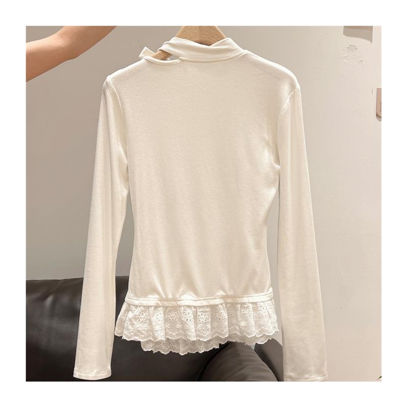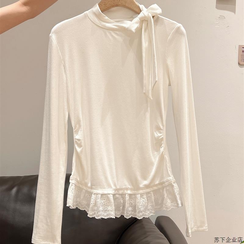 纯欲蝴蝶结绑带蕾丝花边长袖T恤女2025年秋季内搭打底衫拼接上衣