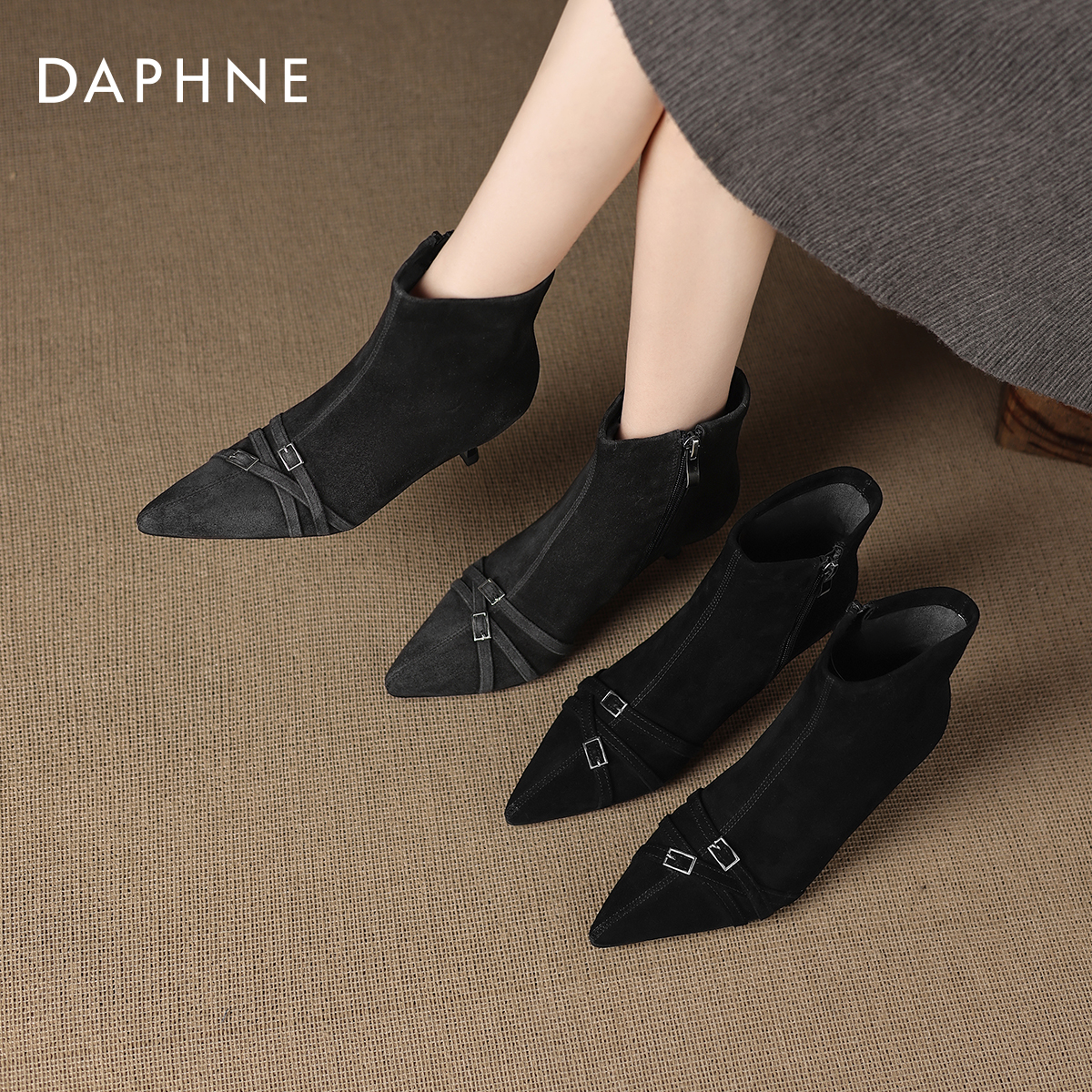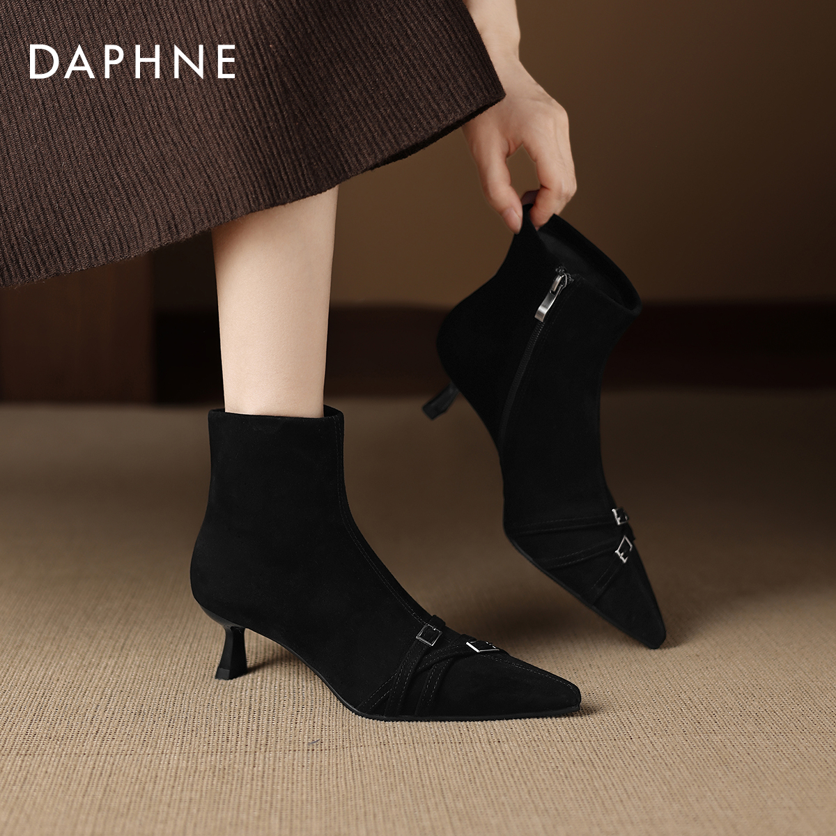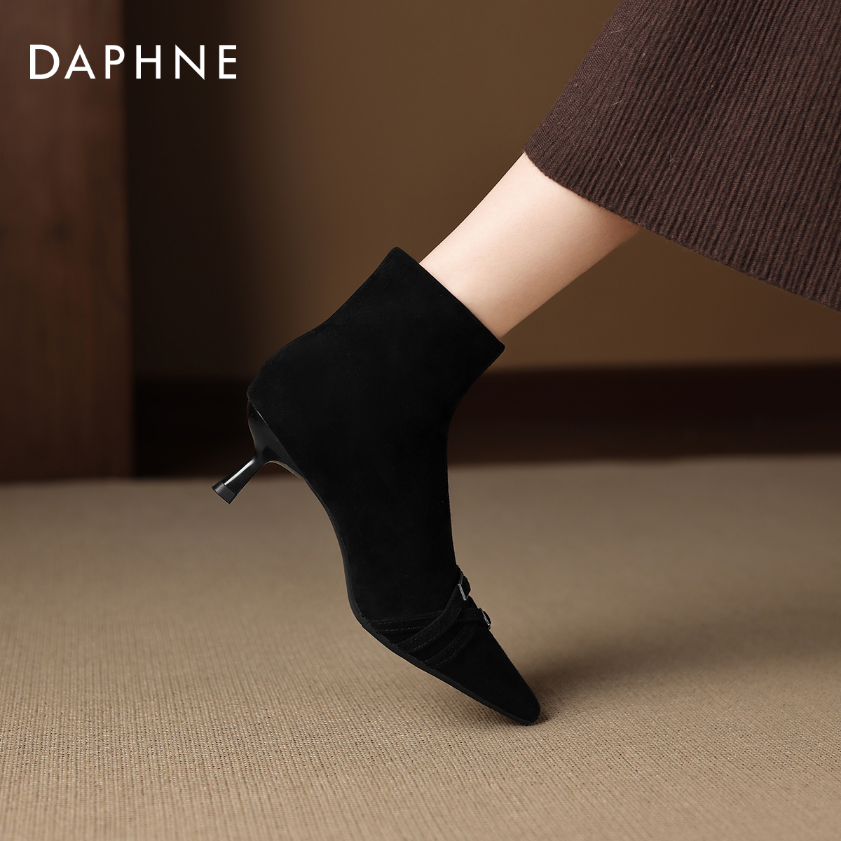达芙妮黑色尖头短靴女细跟瘦瘦靴