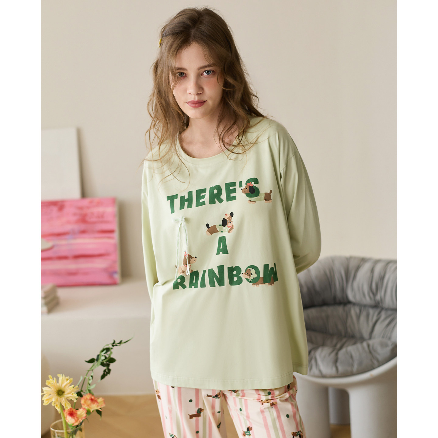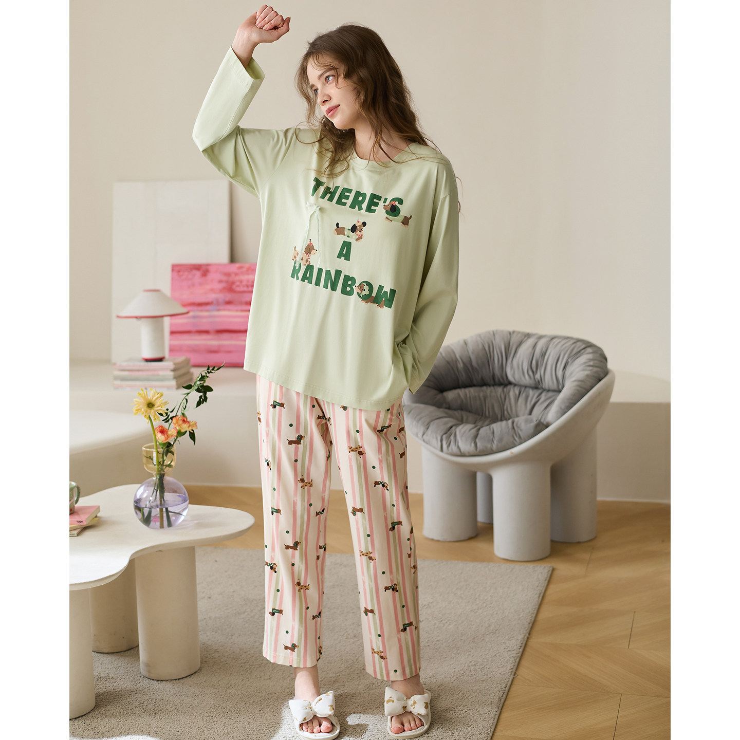 芬腾睡衣女春秋季新款纯棉圆领长袖套装带胸垫可爱休闲舒适家居服